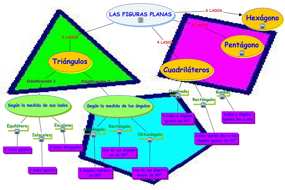 Este Cmap, tiene información relacionada con: Figuras planas, Cuadriláteros Cuadrado 4 lados y ángulos iguales de 90º, Según la medida de sus lados Isósceles 2 lados iguales, LAS FIGURAS PLANAS 4 LADOS Cuadriláteros, Según la medida de los ángulos Rectángulo Uno de sus ángulos es de 90º, LAS FIGURAS PLANAS 5 LADOS Pentágono, Triángulos Clasificación 1 Según la medida de sus lados, Según la medida de sus lados Equilátero 3 lados iguales, Triángulos Clasificación 2 Según la medida de los ángulos, Según la medida de los ángulos Obtusángulo Uno de sus ángulos mayor de 90º, LAS FIGURAS PLANAS 3 LADOS Triángulos, Cuadriláteros Rombo Lados y ángulos iguales dos a dos, LAS FIGURAS PLANAS 6 LADOS Hexágono, Según la medida de sus lados Escaleno 3 lados desiguales, Cuadriláteros Rectángulo Lados iguales dos a dos Ángulos iguales de 90º, Según la medida de los ángulos Acutángulo 3 ángulos menores de 90º