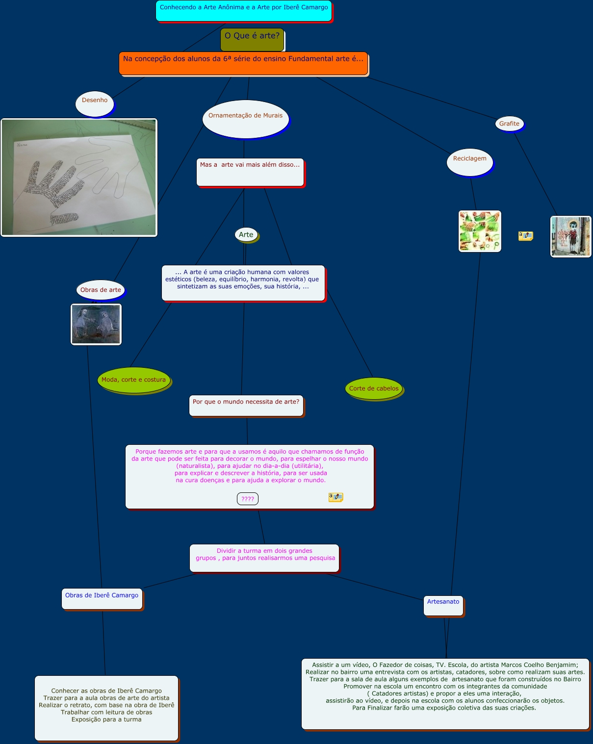 Esse mapa conceitual, produzido no IHMC CmapTools, tem a informação relacionada a: Objeto de Aprendizagem, Conhecer as obras de Iberê Camargo Trazer para a aula obras de arte do artista Realizar o retrato, com base na obra de Iberê Trabalhar com leitura de obras Exposição para a turma ???? Obras de Iberê Camargo, Grafite ???? ????, ???? ???? ... A arte é uma criação humana com valores estéticos (beleza, equilíbrio, harmonia, revolta) que sintetizam as suas emoções, sua história, ..., ???? ???? Dividir a turma em dois grandes grupos , para juntos realisarmos uma pesquisa, Por que o mundo necessita de arte? ???? Porque fazemos arte e para que a usamos é aquilo que chamamos de função da arte que pode ser feita para decorar o mundo, para espelhar o nosso mundo (naturalista), para ajudar no dia-a-dia (utilitária), para explicar e descrever a história, para ser usada na cura doenças e para ajuda a explorar o mundo., Artesanato ???? Assistir a um vídeo, O Fazedor de coisas, TV. Escola, do artista Marcos Coelho Benjamim; Realizar no bairro uma entrevista com os artistas, catadores, sobre como realizam suas artes. Trazer para a sala de aula alguns exemplos de artesanato que foram construídos no Bairro Promover na escola um encontro com os integrantes da comunidade ( Catadores artistas) e propor a eles uma interação, assistirão ao vídeo, e depois na escola com os alunos confeccionarão os objetos. Para Finalizar farão uma exposição coletiva das suas criações., Obras de Iberê Camargo ???? Dividir a turma em dois grandes grupos , para juntos realisarmos uma pesquisa, Na concepção dos alunos da 6ª série do ensino Fundamental arte é... ???? O Que é arte?, Conhecendo a Arte Anônima e a Arte por Iberê Camargo ???? Desenho, O Que é arte? ???? Reciclagem, O Que é arte? ???? Obras de arte, ???? ????, O Que é arte? ???? Ornamentação de Murais, Obras de arte ????, Artesanato ???? Dividir a turma em dois grandes grupos , para juntos realisarmos uma pesquisa, ???? ???? Corte de cabelos, Arte ???? Por que o mundo necessita de arte?, Obras de arte ???? Obras de Iberê Camargo, O Que é arte? ???? Grafite, Na concepção dos alunos da 6ª série do ensino Fundamental arte é... ???? O Que é arte?