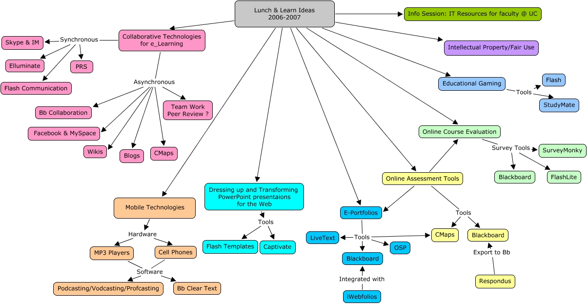 此概念图以 IHMC CmapTools 创建, 内含信息有关于: online education, Online Course Evaluation Survey Tools SurveyMonky, Lunch & Learn Ideas 2006-2007 Online Assessment Tools, Mobile Technologies Hardware MP3 Players, iWebfolios Integrated with Blackboard, Online Assessment Tools Tools CMaps, Lunch & Learn Ideas 2006-2007 Intellectual Property/Fair Use, Collaborative Technologies for e_Learning Synchronous Skype & IM, Lunch & Learn Ideas 2006-2007 Mobile Technologies, Cell Phones Software Bb Clear Text, Dressing up and Transforming PowerPoint presentaions for the Web Tools Captivate, E-Portfolios Tools Blackboard, Online Assessment Tools Tools Blackboard, Lunch & Learn Ideas 2006-2007 Online Course Evaluation, Online Assessment Tools E-Portfolios, Educational Gaming Tools StudyMate, E-Portfolios Tools CMaps, E-Portfolios Tools LiveText, E-Portfolios Tools OSP, Lunch & Learn Ideas 2006-2007 Dressing up and Transforming PowerPoint presentaions for the Web, Online Assessment Tools Online Course Evaluation