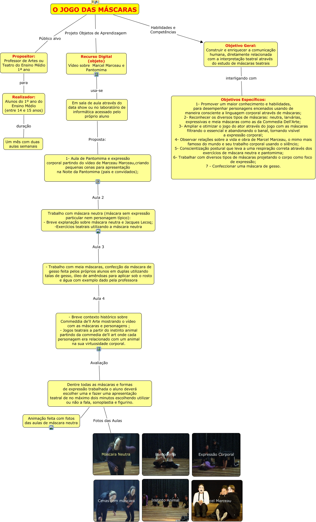 Esse mapa conceitual, produzido no IHMC CmapTools, tem a informação relacionada a: Objetos de Aprendizagem, Recurso Digital (objeto) Vídeo sobre Marcel Marceau e Pantomima usa-se Em sala de aula através do data show ou no laboratório de informática acessado pelo próprio aluno, - Trabalho com meia máscaras, confecção da máscara de gesso feita pelos próprios alunos em duplas utilizando talas de gesso, óleo de amêndoas para aplicar sob o rosto e água com exemplo dado pela professora Aula 4 - Breve contexto histórico sobre Commeddia de'll Arte mostrando o vídeo com as máscaras e personagens ; - Jogos teatrais a partir do instinto animal partindo da commedia de'll art onde cada personagem era relacionado com um animal na sua virtuosidade corporal., Propositor: Professor de Artes ou Teatro do Ensino Médio 1ª ano para Realizador: Alunos do 1º ano do Ensino Médio (entre 14 e 15 anos), - Breve contexto histórico sobre Commeddia de'll Arte mostrando o vídeo com as máscaras e personagens ; - Jogos teatrais a partir do instinto animal partindo da commedia de'll art onde cada personagem era relacionado com um animal na sua virtuosidade corporal. Avaliação Dentre todas as máscaras e formas de expressão trabalhada o aluno deverá escolher uma e fazer uma apresentação teatral de no máximo dois minutos escolhendo utilizar ou não a fala, sonoplastia e figurino., Objetivo Geral: Construir e enriquecer a comunicação humana, diretamente relacionada com a interpretação teatral através do estudo de máscaras teatrais interligando com Objetivos Específicos: 1- Promover um maior conhecimento e habilidades, para desempenhar personagens encenados usando de maneira consciente a linguagem corporal através de máscaras; 2- Reconhecer os diversos tipos de máscaras: neutra, larvárias, expressivas e meia máscaras como as da Commedia Dell'Arte; 3- Ampliar e otimizar o jogo do ator através do jogo com as máscaras filtrando o essencial e abandonando o banal, tornando visível a expressão corporal; 4- Observar relações sobre a vida e obra de Marcel Marceau, o mimo mais famoso do mundo e seu trabalho corporal usando o silêncio; 5- Conscientização postural que leva a uma respiração correta através dos exercícios de máscara neutra e pantomima; 6- Trabalhar com diversos tipos de máscaras projetando o corpo como foco de expressão; 7 - Confeccionar uma máscara de gesso., Dentre todas as máscaras e formas de expressão trabalhada o aluno deverá escolher uma e fazer uma apresentação teatral de no máximo dois minutos escolhendo utilizar ou não a fala, sonoplastia e figurino. Fotos das Aulas Máscara Neutra, Dentre todas as máscaras e formas de expressão trabalhada o aluno deverá escolher uma e fazer uma apresentação teatral de no máximo dois minutos escolhendo utilizar ou não a fala, sonoplastia e figurino. Animação feita com fotos das aulas de máscara neutra, Realizador: Alunos do 1º ano do Ensino Médio (entre 14 e 15 anos) duração Um mês com duas aulas semanais, Trabalho com máscara neutra (máscara sem expressão particular nem personagem típico): - Breve explanação sobre máscara neutra e Jacques Lecoq; -Exercícios teatrais utilizando a máscara neutra Aula 3 - Trabalho com meia máscaras, confecção da máscara de gesso feita pelos próprios alunos em duplas utilizando talas de gesso, óleo de amêndoas para aplicar sob o rosto e água com exemplo dado pela professora, Em sala de aula através do data show ou no laboratório de informática acessado pelo próprio aluno Proposta: 1- Aula de Pantomima e expressão corporal partindo do vídeo de Marceau Marceau,criando pequenas cenas para apresentação na Noite da Pantomima (pais e convidados);, O JOGO DAS MÁSCARAS Habilidades e Competências Objetivo Geral: Construir e enriquecer a comunicação humana, diretamente relacionada com a interpretação teatral através do estudo de máscaras teatrais, O JOGO DAS MÁSCARAS Projeto Objetos de Aprendizagem Recurso Digital (objeto) Vídeo sobre Marcel Marceau e Pantomima, 1- Aula de Pantomima e expressão corporal partindo do vídeo de Marceau Marceau,criando pequenas cenas para apresentação na Noite da Pantomima (pais e convidados); Aula 2 Trabalho com máscara neutra (máscara sem expressão particular nem personagem típico): - Breve explanação sobre máscara neutra e Jacques Lecoq; -Exercícios teatrais utilizando a máscara neutra, O JOGO DAS MÁSCARAS Público alvo Propositor: Professor de Artes ou Teatro do Ensino Médio 1ª ano