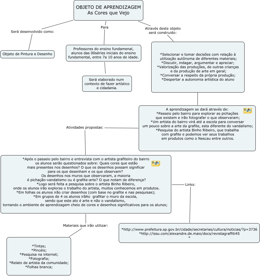 Esse mapa conceitual, produzido no IHMC CmapTools, tem a informação relacionada a: objeto de aprendizagem, *Após o passeio pelo bairro e entrevista com o artista grafiteiro do bairro os alunos serão questionados sobre: Quais cores que estão mais presentes nos desenhos? O que os desenhos possam significar para os que desenham e os que observam? Os desenhos nos muros que observaram, a maioria é pichação-vandalismo ou é grafite-arte? O que notam de diferença? *Logo será feita a pesquisa sobre o artista Binho Ribeiro, onde os alunos irão exploras o trabalho do artista, muitos conhecemos em produtos. *Em folhas os alunos irão criar desenhos (com base no grafite e nas pesquisas); *Em grupos de 4 os alunos irãAo grafitar o muro da escola, sendo que este ato é arte e não o vandalismo, tornando o ambiente de aprendizagem cheio de cores e desenhos significativos para os alunos; Materiais que irão utilizar: *Tintas; *Pincéis; *Pesquisa na internet; *Fotografia; *Relato de artista da comunidade; *Folhas branca;, A aprendizagem se dará através de: *Passeio pelo bairro para explorar as pichações que existem e irão fotografar o que observaram; *Um artista do bairro virá até a escola para conversar um pouco sobre a arte da grafite, esta diferente do vandalismo; *Pesquisa do artista Binho Ribeiro, que trabalha com grafite e podemos ver seus trabalhos em produtos como o Nescau entre outros. Atividades propostas: *Após o passeio pelo bairro e entrevista com o artista grafiteiro do bairro os alunos serão questionados sobre: Quais cores que estão mais presentes nos desenhos? O que os desenhos possam significar para os que desenham e os que observam? Os desenhos nos muros que observaram, a maioria é pichação-vandalismo ou é grafite-arte? O que notam de diferença? *Logo será feita a pesquisa sobre o artista Binho Ribeiro, onde os alunos irão exploras o trabalho do artista, muitos conhecemos em produtos. *Em folhas os alunos irão criar desenhos (com base no grafite e nas pesquisas); *Em grupos de 4 os alunos irãAo grafitar o muro da escola, sendo que este ato é arte e não o vandalismo, tornando o ambiente de aprendizagem cheio de cores e desenhos significativos para os alunos;, *Selecionar e tomar decisões com relação à utilização autônoma de diferentes materiais; *Discutir, indagar, argumentar e apreciar; *Valorização das produções, de outras crianças e da produção de arte em geral; *Conversar a respeito da própria produção; *Despertar a autonomia artística do aluno ???? A aprendizagem se dará através de: *Passeio pelo bairro para explorar as pichações que existem e irão fotografar o que observaram; *Um artista do bairro virá até a escola para conversar um pouco sobre a arte da grafite, esta diferente do vandalismo; *Pesquisa do artista Binho Ribeiro, que trabalha com grafite e podemos ver seus trabalhos em produtos como o Nescau entre outros., *Após o passeio pelo bairro e entrevista com o artista grafiteiro do bairro os alunos serão questionados sobre: Quais cores que estão mais presentes nos desenhos? O que os desenhos possam significar para os que desenham e os que observam? Os desenhos nos muros que observaram, a maioria é pichação-vandalismo ou é grafite-arte? O que notam de diferença? *Logo será feita a pesquisa sobre o artista Binho Ribeiro, onde os alunos irão exploras o trabalho do artista, muitos conhecemos em produtos. *Em folhas os alunos irão criar desenhos (com base no grafite e nas pesquisas); *Em grupos de 4 os alunos irãAo grafitar o muro da escola, sendo que este ato é arte e não o vandalismo, tornando o ambiente de aprendizagem cheio de cores e desenhos significativos para os alunos; Links: *http://www.prefeitura.sp.gov.br/cidade/secretarias/cultura/noticias/?p=3736 *http://issu.com/alexandre.de.maio/docs/revistagraffiti45 *, OBJETO DE APRENDIZAGEM As Cores que Vejo Será desenvolvido como: Objeto de Pintura e Desenho, Professores do ensino fundamenal, alunos das 00séries iniciais do ensino fundamental, entre 7a 10 anos de idade. Será elaborado num contexto de fazer artístico e cidadania., OBJETO DE APRENDIZAGEM As Cores que Vejo Através deste objeto será construido: *Selecionar e tomar decisões com relação à utilização autônoma de diferentes materiais; *Discutir, indagar, argumentar e apreciar; *Valorização das produções, de outras crianças e da produção de arte em geral; *Conversar a respeito da própria produção; *Despertar a autonomia artística do aluno, OBJETO DE APRENDIZAGEM As Cores que Vejo Para Professores do ensino fundamenal, alunos das 00séries iniciais do ensino fundamental, entre 7a 10 anos de idade.