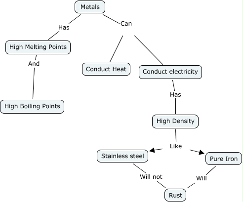 This Concept Map, created with IHMC CmapTools, has information related to: YingXuan_draft1, Conduct electricity Has High Density, Metals Has High Melting Points, Stainless steel Will not Rust, High Density Like Pure Iron, Metals Can Conduct Heat, High Melting Points And High Boiling Points, Metals Can Conduct electricity, Pure Iron Will Rust, High Density Like Stainless steel