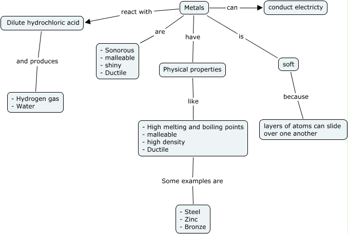 This Concept Map, created with IHMC CmapTools, has information related to: Meiyi_draft 1, Dilute hydrochloric acid and produces - Hydrogen gas - Water, Metals react with Dilute hydrochloric acid, Physical properties like - High melting and boiling points - malleable - high density - Ductile, Metals are - Sonorous - malleable - shiny - Ductile, soft because layers of atoms can slide over one another, Metals is soft, - High melting and boiling points - malleable - high density - Ductile Some examples are - Steel - Zinc - Bronze, Metals can conduct electricty, Metals have Physical properties