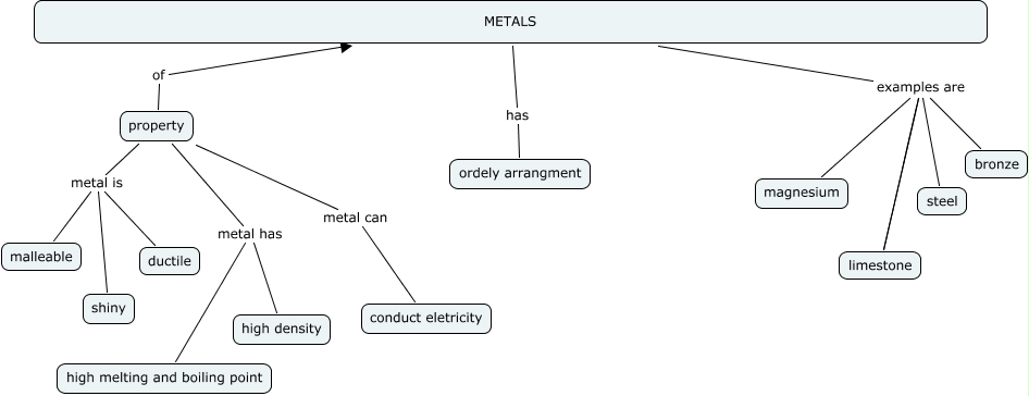 This Concept Map, created with IHMC CmapTools, has information related to: pohsoonhian_draft 1, METALS examples are limestone, METALS examples are magnesium, property metal is ductile, METALS examples are bronze, property of METALS, property metal has high density, METALS examples are steel, METALS has ordely arrangment, property metal can conduct eletricity, METALS examples are limestone, property metal is malleable, property metal is shiny, property metal has high melting and boiling point