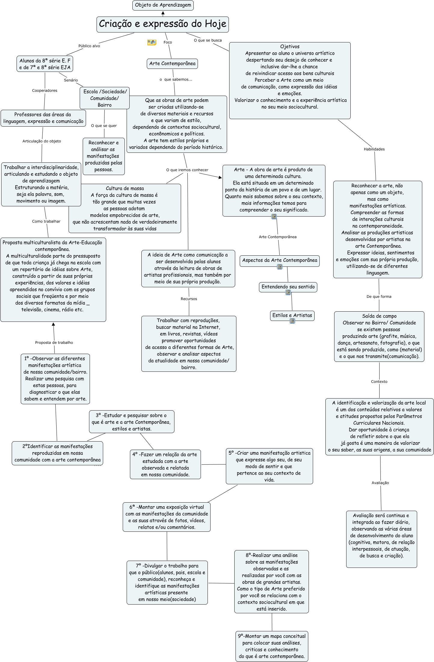 Esse mapa conceitual, produzido no IHMC CmapTools, tem a informação relacionada a: Objeto de Aprendizagem, Trabalhar a interdisciplinaridade, articulando e estudando o objeto de aprendizagem Estruturando a matéria, seja ela palavra, som, movimento ou imagem. Como trabalhar Proposta multiculturalista da Arte-Educação contemporânea. A multiculturalidade parte do pressuposto de que toda criança já chega na escola com um repertório de idéias sobre Arte, construído a partir de suas próprias experiências, dos valores e idéias apreendidos no convívio com os grupos sociais que freqüenta e por meio dos diversos formatos da mídia _ televisão, cinema, rádio etc., A identificação e valorização da arte local é um dos conteúdos relativos a valores e atitudes propostos pelos Parâmetros Curriculares Nacionais. Dar oportunidade à criança de refletir sobre o que ela já gosta é uma maneira de valorizar o seu saber, as suas origens, a sua comunidade Avaliação Avaliação será continua e integrada ao fazer diário, observando as várias áreas de desenvolvimento do aluno (cognitiva, motora, de relação interpessoais, de atuação, de busca e criação)., 4º -Fazer um relação da arte estudada com a arte observada e relatada em nossa comunidade. ???? 5º -Criar uma manifestação artistica que expresse algo seu, de seu modo de sentir e que pertence ao seu contexto de vida., Criação e expressão do Hoje Foco Arte Contemporânea, Arte - A obra de arte é produto de uma determinada cultura. Ela está situada em um determinado ponto da história de um povo e de um lugar. Quanto mais sabemos sobre o seu contexto, mais informações temos para compreender o seu significado. Arte Contemporânea Aspectos da Arte Contemporânea, Criação e expressão do Hoje O que se busca Ojetivos Apresentar ao aluno o universo artístico despertando seu desejo de conhecer e inclusive dar-lhe a chance de reivindicar acesso aos bens culturais Perceber a Arte como um meio de comunicação, como expressão das idéias e emoções. Valorizar o conhecimento e a experiência artística no seu meio sociocultural., A ideia de Arte como comunicação a ser desenvolvida pelas alunos através da leitura de obras de artistas profissionais, mas também por meio de sua própria produção. Recursos Trabalhar com reproduções, buscar material na Internet, em livros, revistas, vídeos promover oportunidades de acesso a diferentes formas de Arte, observar e analisar aspectos da atualidade em nossa comunidade/ bairro., Que as obras de arte podem ser criadas utilizando-se de diversos materiais e recursos e que variam de estilo, dependendo de contextos sociocultural, econônomicos e políticos. A arte tem estilos próprios e variados dependendo do período histórico. O que iremos conhecer A ideia de Arte como comunicação a ser desenvolvida pelas alunos através da leitura de obras de artistas profissionais, mas também por meio de sua própria produção., Arte Contemporânea o que sabemos... Que as obras de arte podem ser criadas utilizando-se de diversos materiais e recursos e que variam de estilo, dependendo de contextos sociocultural, econônomicos e políticos. A arte tem estilos próprios e variados dependendo do período histórico., 8º-Realizar uma análise sobre as manifestações observadas e as realizadas por você com as obras de grandes artistas. Como o tipo de Arte preferido por você se relaciona com o contexto sociocultural em que está inserido. ???? 9º-Montar um mapa conceitual para colocar suas análises, criticas e conhecimento do que é arte contemporânea., Alunos da 8ª série E. F e de 7ª e 8ª série EJA Cooperadores Professores das áreas da linguagem, expressão e comunicação, Alunos da 8ª série E. F e de 7ª e 8ª série EJA Senário Escola /Sociedade/ Comunidade/ Bairro, Reconhecer a arte, não apenas como um objeto, mas como manifestações artísticas. Compreender as formas de interações culturais na contemporaneidade. Analisar as produções artisticas desenvolvidas por artistas na arte Contemporânea. Expressar ideias, sentimentos e emoções com sua própria produção, utilizando-se de diferentes linguagem. De que forma Saída de campo Observar no Bairro/ Comunidade se existem pessoas produzindo arte (grafite, música, dança, artesanato, fotografia), o que está sendo produzido, como (material) e o que nos transmite(comunicação)., Saída de campo Observar no Bairro/ Comunidade se existem pessoas produzindo arte (grafite, música, dança, artesanato, fotografia), o que está sendo produzido, como (material) e o que nos transmite(comunicação). Contexto A identificação e valorização da arte local é um dos conteúdos relativos a valores e atitudes propostos pelos Parâmetros Curriculares Nacionais. Dar oportunidade à criança de refletir sobre o que ela já gosta é uma maneira de valorizar o seu saber, as suas origens, a sua comunidade, Entendendo seu sentido ???? Aspectos da Arte Contemporânea, 2ºIdentificar as manifestações reproduzidas em nossa comunidade com a arte contemporânea ???? 1º -Observar as diferentes manifestações artística de nossa comunidade/bairro. Realizar uma pesquisa com estas pessoas, para diagnosticar o que elas sabem e entendem por arte., Criação e expressão do Hoje ???? Objeto de Aprendizagem, Que as obras de arte podem ser criadas utilizando-se de diversos materiais e recursos e que variam de estilo, dependendo de contextos sociocultural, econônomicos e políticos. A arte tem estilos próprios e variados dependendo do período histórico. O que iremos conhecer Cultura de massa A força da cultura de massa é tão grande que muitas vezes as pessoas adotam modelos empobrecidos de arte, que não acrescentam nada de verdadeiramente transformador às suas vidas, 3º -Estudar e pesquisar sobre o que é arte e a arte Contemporânea, estilos e artistas. ???? 4º -Fazer um relação da arte estudada com a arte observada e relatada 
