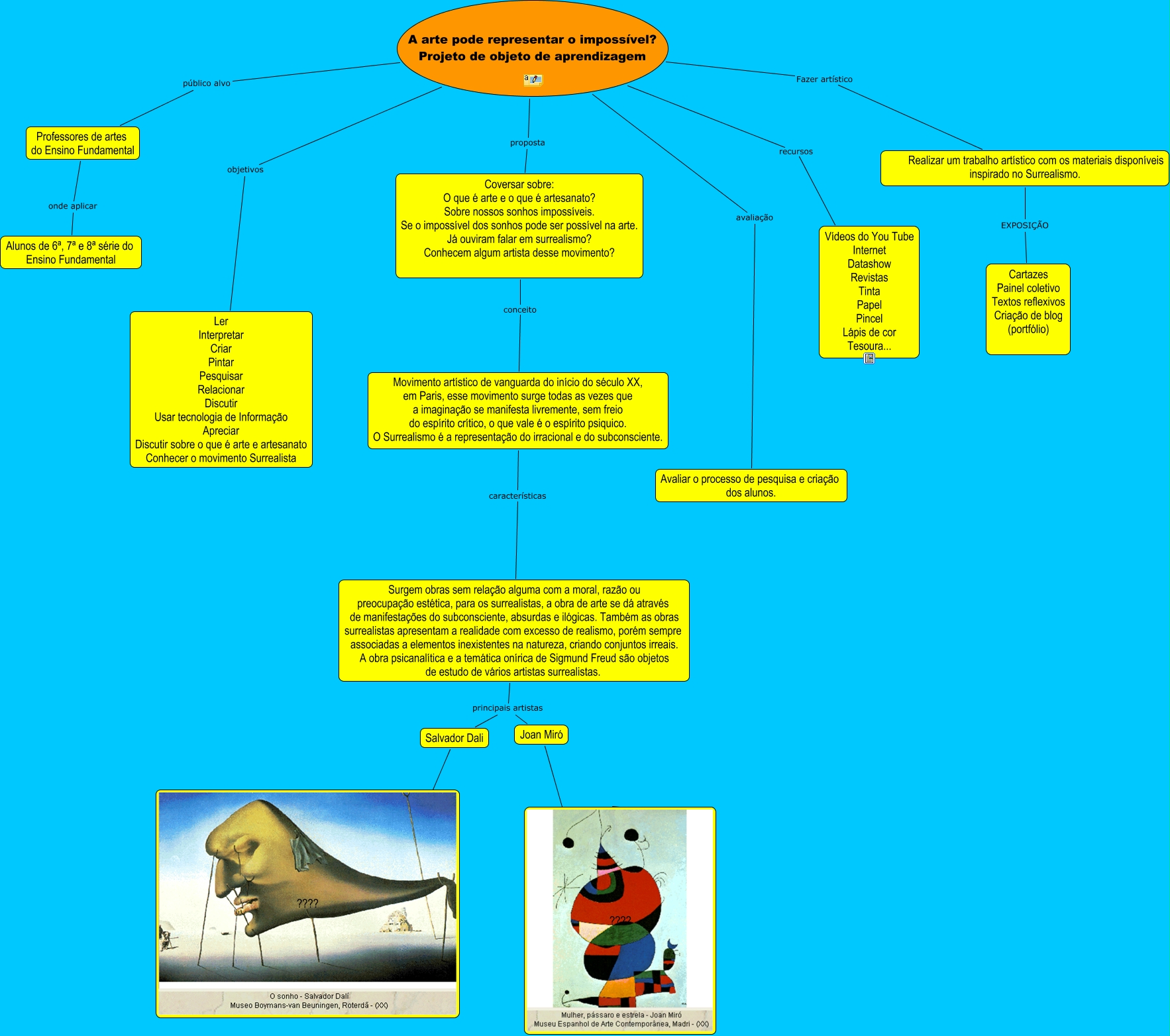 Esse mapa conceitual, produzido no IHMC CmapTools, tem a informação relacionada a: objeto de aprendizagem 2, Joan Miró ???? ????, A arte pode representar o impossível? Projeto de objeto de aprendizagem avaliação Avaliar o processo de pesquisa e criação dos alunos., A arte pode representar o impossível? Projeto de objeto de aprendizagem proposta Coversar sobre: O que é arte e o que é artesanato? Sobre nossos sonhos impossíveis. Se o impossível dos sonhos pode ser possível na arte. Já ouviram falar em surrealismo? Conhecem algum artista desse movimento?, A arte pode representar o impossível? Projeto de objeto de aprendizagem recursos Vídeos do You Tube Internet Datashow Revistas Tinta Papel Pincel Lápis de cor Tesoura..., A arte pode representar o impossível? Projeto de objeto de aprendizagem público alvo Professores de artes do Ensino Fundamental, Coversar sobre: O que é arte e o que é artesanato? Sobre nossos sonhos impossíveis. Se o impossível dos sonhos pode ser possível na arte. Já ouviram falar em surrealismo? Conhecem algum artista desse movimento? conceito Movimento artístico de vanguarda do início do século XX, em Paris, esse movimento surge todas as vezes que a imaginação se manifesta livremente, sem freio do espírito crítico, o que vale é o espírito psiquico. O Surrealismo é a representação do irracional e do subconsciente., Professores de artes do Ensino Fundamental onde aplicar Alunos de 6ª, 7ª e 8ª série do Ensino Fundamental, Surgem obras sem relação alguma com a moral, razão ou preocupação estética, para os surrealistas, a obra de arte se dá através de manifestações do subconsciente, absurdas e ilógicas. Também as obras surrealistas apresentam a realidade com excesso de realismo, porém sempre associadas a elementos inexistentes na natureza, criando conjuntos irreais. A obra psicanalítica e a temática onírica de Sigmund Freud são objetos de estudo de vários artistas surrealistas. principais artistas Salvador Dali, Movimento artístico de vanguarda do início do século XX, em Paris, esse movimento surge todas as vezes que a imaginação se manifesta livremente, sem freio do espírito crítico, o que vale é o espírito psiquico. O Surrealismo é a representação do irracional e do subconsciente. características Surgem obras sem relação alguma com a moral, razão ou preocupação estética, para os surrealistas, a obra de arte se dá através de manifestações do subconsciente, absurdas e ilógicas. Também as obras surrealistas apresentam a realidade com excesso de realismo, porém sempre associadas a elementos inexistentes na natureza, criando conjuntos irreais. A obra psicanalítica e a temática onírica de Sigmund Freud são objetos de estudo de vários artistas surrealistas., Surgem obras sem relação alguma com a moral, razão ou preocupação estética, para os surrealistas, a obra de arte se dá através de manifestações do subconsciente, absurdas e ilógicas. Também as obras surrealistas apresentam a realidade com excesso de realismo, porém sempre associadas a elementos inexistentes na natureza, criando conjuntos irreais. A obra psicanalítica e a temática onírica de Sigmund Freud são objetos de estudo de vários artistas surrealistas. principais artistas Joan Miró, Realizar um trabalho artístico com os materiais disponíveis inspirado no Surrealismo. EXPOSIÇÃO Cartazes Painel coletivo Textos reflexivos Criação de blog (portfólio), A arte pode representar o impossível? Projeto de objeto de aprendizagem objetivos Ler Interpretar Criar Pintar Pesquisar Relacionar Discutir Usar tecnologia de Informação Apreciar Discutir sobre o que é arte e artesanato Conhecer o movimento Surrealista, A arte pode representar o impossível? Projeto de objeto de aprendizagem Fazer artístico Realizar um trabalho artístico com os materiais disponíveis inspirado no Surrealismo., Salvador Dali ???? ????