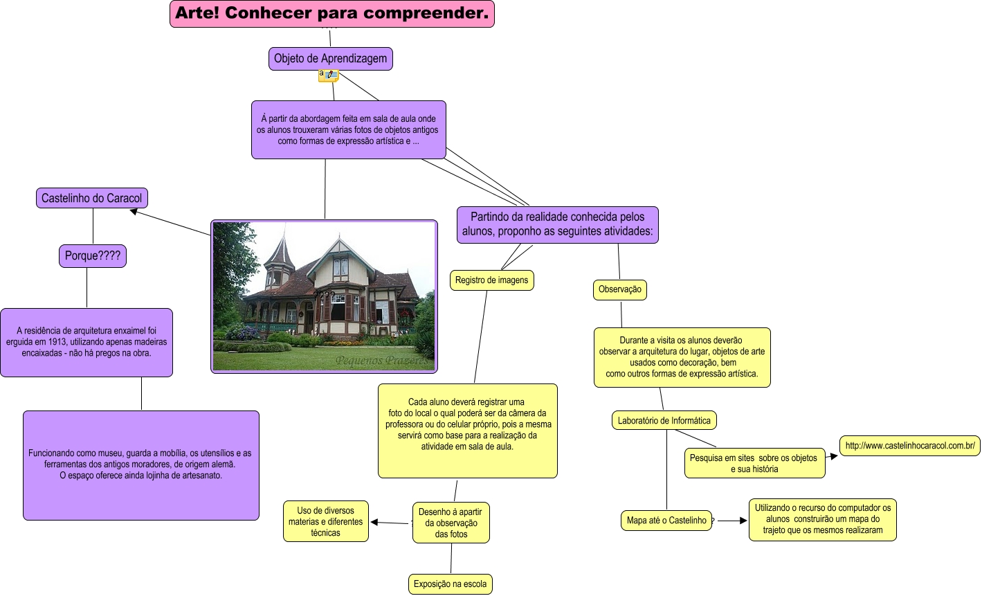 Esse mapa conceitual, produzido no IHMC CmapTools, tem a informação relacionada a: objeto de aprendizagem, Observação ???? Durante a visita os alunos deverão observar a arquitetura do lugar, objetos de arte usados como decoração, bem como outros formas de expressão artística., Partindo da realidade conhecida pelos alunos, proponho as seguintes atividades: ???? Observação, Partindo da realidade conhecida pelos alunos, proponho as seguintes atividades: ???? Registro de imagens, Laboratório de Informática ???? Mapa até o Castelinho, Partindo da realidade conhecida pelos alunos, proponho as seguintes atividades: ???? À partir da abordagem feita em sala de aula onde os alunos trouxeram várias fotos de objetos antigos como formas de expressão artística e ..., Objeto de Aprendizagem ???? ????, Durante a visita os alunos deverão observar a arquitetura do lugar, objetos de arte usados como decoração, bem como outros formas de expressão artística. ???? Laboratório de Informática, Laboratório de Informática ???? Pesquisa em sites sobre os objetos e sua história, Porque???? ???? A residência de arquitetura enxaimel foi erguida em 1913, utilizando apenas madeiras encaixadas - não há pregos na obra., Desenho à apartir da observação das fotos ???? Exposição na escola, Mapa até o Castelinho ???? Utilizando o recurso do computador os alunos construirão um mapa do trajeto que os mesmos realizaram, Partindo da realidade conhecida pelos alunos, proponho as seguintes atividades: ???? ????, Cada aluno deverá registrar uma foto do local o qual poderá ser da câmera da professora ou do celular próprio, pois a mesma servirá como base para a realização da atividade em sala de aula. ???? Desenho à apartir da observação das fotos, ???? ???? Castelinho do Caracol, Arte! Conhecer para compreender. ???? Objeto de Aprendizagem, Desenho à apartir da observação das fotos ???? Uso de diversos materias e diferentes técnicas, Partindo da realidade conhecida pelos alunos, proponho as seguintes atividades: ???? Cada aluno deverá registrar uma foto do local o qual poderá ser da câmera da professora ou do celular próprio, pois a mesma servirá como base para a realização da atividade em sala de aula., Pesquisa em sites sobre os objetos e sua história ???? http://www.castelinhocaracol.com.br/, Castelinho do Caracol ???? Porque????, A residência de arquitetura enxaimel foi erguida em 1913, utilizando apenas madeiras encaixadas - não há pregos na obra. ???? Funcionando como museu, guarda a mobília, os utensílios e as ferramentas dos antigos moradores, de origem alemã. O espaço oferece ainda lojinha de artesanato.