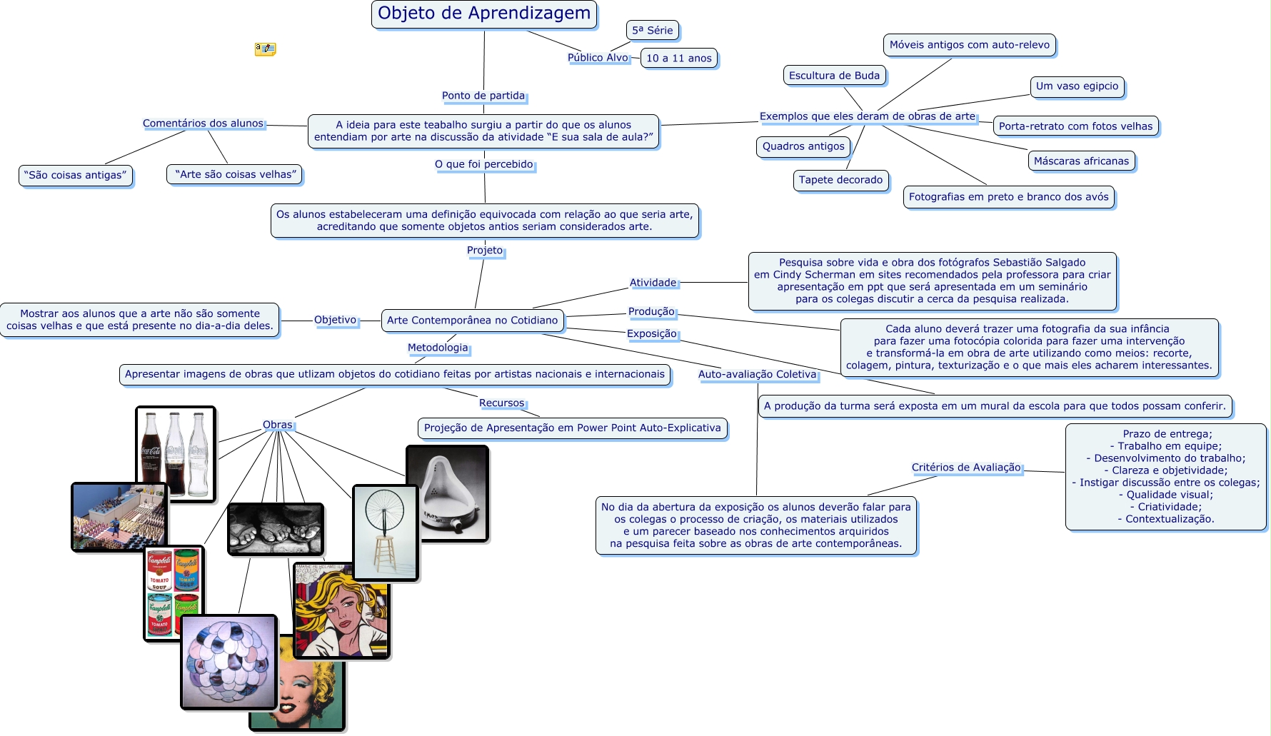 Esse mapa conceitual, produzido no IHMC CmapTools, tem a informação relacionada a: Obj. Aprend. Nilva, A ideia para este teabalho surgiu a partir do que os alunos entendiam por arte na discussão da atividade “E sua sala de aula?” Exemplos que eles deram de obras de arte Fotografias em preto e branco dos avós, Objeto de Aprendizagem Ponto de partida A ideia para este teabalho surgiu a partir do que os alunos entendiam por arte na discussão da atividade “E sua sala de aula?”, Apresentar imagens de obras que utlizam objetos do cotidiano feitas por artistas nacionais e internacionais Obras, A ideia para este teabalho surgiu a partir do que os alunos entendiam por arte na discussão da atividade “E sua sala de aula?” Exemplos que eles deram de obras de arte Porta-retrato com fotos velhas, Apresentar imagens de obras que utlizam objetos do cotidiano feitas por artistas nacionais e internacionais Obras, Arte Contemporânea no Cotidiano Metodologia Apresentar imagens de obras que utlizam objetos do cotidiano feitas por artistas nacionais e internacionais, Apresentar imagens de obras que utlizam objetos do cotidiano feitas por artistas nacionais e internacionais Obras, Arte Contemporânea no Cotidiano Objetivo Mostrar aos alunos que a arte não são somente coisas velhas e que está presente no dia-a-dia deles., Apresentar imagens de obras que utlizam objetos do cotidiano feitas por artistas nacionais e internacionais Obras, A ideia para este teabalho surgiu a partir do que os alunos entendiam por arte na discussão da atividade “E sua sala de aula?” Exemplos que eles deram de obras de arte Quadros antigos, Apresentar imagens de obras que utlizam objetos do cotidiano feitas por artistas nacionais e internacionais Obras, A ideia para este teabalho surgiu a partir do que os alunos entendiam por arte na discussão da atividade “E sua sala de aula?” Exemplos que eles deram de obras de arte Tapete decorado, Apresentar imagens de obras que utlizam objetos do cotidiano feitas por artistas nacionais e internacionais Recursos Projeção de Apresentação em Power Point Auto-Explicativa, Arte Contemporânea no Cotidiano Atividade Pesquisa sobre vida e obra dos fotógrafos Sebastião Salgado em Cindy Scherman em sites recomendados pela professora para criar apresentação em ppt que será apresentada em um seminário para os colegas discutir a cerca da pesquisa realizada., Apresentar imagens de obras que utlizam objetos do cotidiano feitas por artistas nacionais e internacionais Obras, A ideia para este teabalho surgiu a partir do que os alunos entendiam por arte na discussão da atividade “E sua sala de aula?” Exemplos que eles deram de obras de arte Um vaso egipcio, Os alunos estabeleceram uma definição equivocada com relação ao que seria arte, acreditando que somente objetos antios seriam considerados arte. Projeto Arte Contemporânea no Cotidiano, A ideia para este teabalho surgiu a partir do que os alunos entendiam por arte na discussão da atividade “E sua sala de aula?” O que foi percebido Os alunos estabeleceram uma definição equivocada com relação ao que seria arte, acreditando que somente objetos antios seriam considerados arte., A ideia para este teabalho surgiu a partir do que os alunos entendiam por arte na discussão da atividade “E sua sala de aula?” Comentários dos alunos “São coisas antigas”, Arte Contemporânea no Cotidiano Exposição A produção da turma será exposta em um mural da escola para que todos possam conferir.