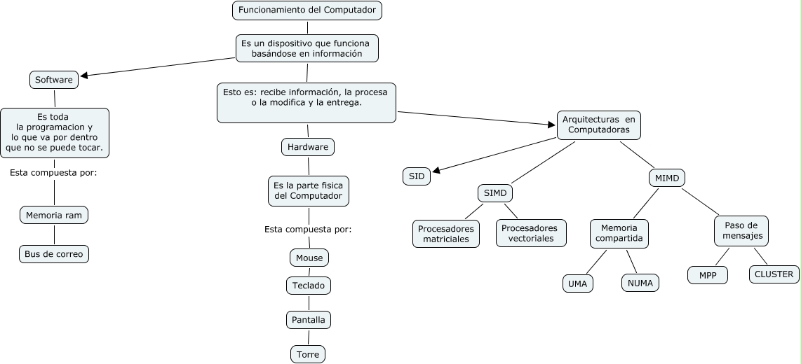 Este Cmap, tiene información relacionada con: computador1, Esto es: recibe información, la procesa o la modifica y la entrega. Hardware, Esto es: recibe información, la procesa o la modifica y la entrega. Arquitecturas en Computadoras, Arquitecturas en Computadoras MIMD, SIMD Procesadores matriciales, Hardware Es la parte fisica del Computador, Es toda la programacion y lo que va por dentro que no se puede tocar. Esta compuesta por: Memoria ram, Memoria ram Bus de correo, Arquitecturas en Computadoras SID, Es la parte fisica del Computador Esta compuesta por: Mouse, MIMD Memoria compartida, Es un dispositivo que funciona basándose en información Esto es: recibe información, la procesa o la modifica y la entrega., Paso de mensajes CLUSTER, Funcionamiento del Computador Es un dispositivo que funciona basándose en información, Memoria compartida NUMA, Es un dispositivo que funciona basándose en información Software, Mouse Teclado, Pantalla Torre, SIMD Procesadores vectoriales, Teclado Pantalla, Arquitecturas en Computadoras SIMD