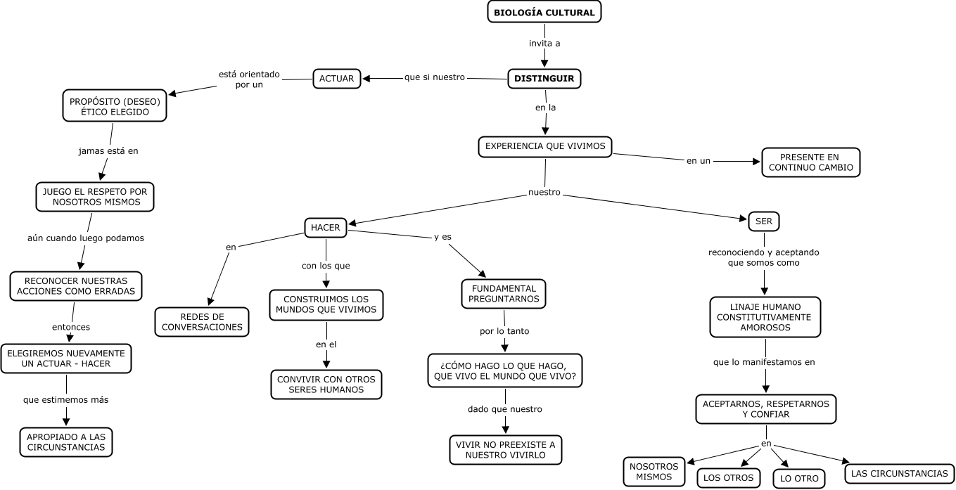 Este Cmap, tiene información relacionada con: Mi reflexión sobre la invitación de la Biología Cultural, HACER en REDES DE CONVERSACIONES, EXPERIENCIA QUE VIVIMOS en un PRESENTE EN CONTINUO CAMBIO, EXPERIENCIA QUE VIVIMOS nuestro HACER, BIOLOGÍA CULTURAL invita a DISTINGUIR, ¿CÓMO HAGO LO QUE HAGO, QUE VIVO EL MUNDO QUE VIVO? dado que nuestro VIVIR NO PREEXISTE A NUESTRO VIVIRLO, JUEGO EL RESPETO POR NOSOTROS MISMOS aún cuando luego podamos RECONOCER NUESTRAS ACCIONES COMO ERRADAS, PROPÓSITO (DESEO) ÉTICO ELEGIDO jamas está en JUEGO EL RESPETO POR NOSOTROS MISMOS, ACTUAR está orientado por un PROPÓSITO (DESEO) ÉTICO ELEGIDO, HACER y es FUNDAMENTAL PREGUNTARNOS, LINAJE HUMANO CONSTITUTIVAMENTE AMOROSOS que lo manifestamos en ACEPTARNOS, RESPETARNOS Y CONFIAR, FUNDAMENTAL PREGUNTARNOS por lo tanto ¿CÓMO HAGO LO QUE HAGO, QUE VIVO EL MUNDO QUE VIVO?, EXPERIENCIA QUE VIVIMOS nuestro SER, ACEPTARNOS, RESPETARNOS Y CONFIAR en LOS OTROS, DISTINGUIR que si nuestro ACTUAR, ELEGIREMOS NUEVAMENTE UN ACTUAR - HACER que estimemos más APROPIADO A LAS CIRCUNSTANCIAS, DISTINGUIR en la EXPERIENCIA QUE VIVIMOS, CONSTRUIMOS LOS MUNDOS QUE VIVIMOS en el CONVIVIR CON OTROS SERES HUMANOS, RECONOCER NUESTRAS ACCIONES COMO ERRADAS entonces ELEGIREMOS NUEVAMENTE UN ACTUAR - HACER, ACEPTARNOS, RESPETARNOS Y CONFIAR en LAS CIRCUNSTANCIAS, ACEPTARNOS, RESPETARNOS Y CONFIAR en NOSOTROS MISMOS