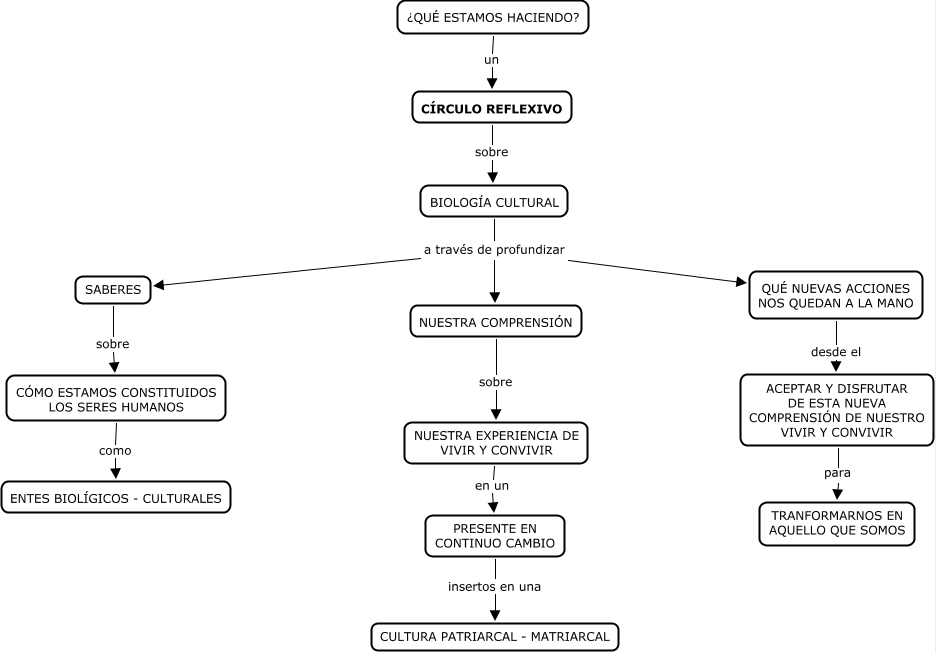 Este Cmap, tiene información relacionada con: Nuestro círculo reflexivo, PRESENTE EN CONTINUO CAMBIO insertos en una CULTURA PATRIARCAL - MATRIARCAL, BIOLOGÍA CULTURAL a través de profundizar NUESTRA COMPRENSIÓN, CÍRCULO REFLEXIVO sobre BIOLOGÍA CULTURAL, BIOLOGÍA CULTURAL a través de profundizar SABERES, ACEPTAR Y DISFRUTAR DE ESTA NUEVA COMPRENSIÓN DE NUESTRO VIVIR Y CONVIVIR para TRANFORMARNOS EN AQUELLO QUE SOMOS, CÓMO ESTAMOS CONSTITUIDOS LOS SERES HUMANOS como ENTES BIOLÍGICOS - CULTURALES, NUESTRA COMPRENSIÓN sobre NUESTRA EXPERIENCIA DE VIVIR Y CONVIVIR, ¿QUÉ ESTAMOS HACIENDO? un CÍRCULO REFLEXIVO, NUESTRA EXPERIENCIA DE VIVIR Y CONVIVIR en un PRESENTE EN CONTINUO CAMBIO, QUÉ NUEVAS ACCIONES NOS QUEDAN A LA MANO desde el ACEPTAR Y DISFRUTAR DE ESTA NUEVA COMPRENSIÓN DE NUESTRO VIVIR Y CONVIVIR, SABERES sobre CÓMO ESTAMOS CONSTITUIDOS LOS SERES HUMANOS, BIOLOGÍA CULTURAL a través de profundizar QUÉ NUEVAS ACCIONES NOS QUEDAN A LA MANO