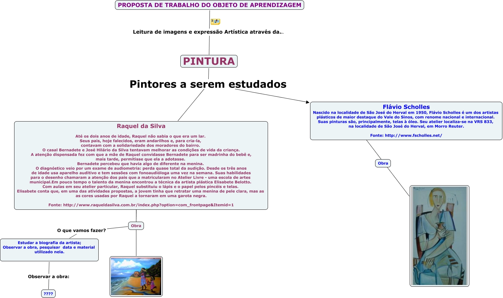 Esse mapa conceitual, produzido no IHMC CmapTools, tem a informação relacionada a: Proposta do objeto de aprendizagem, PINTURA Pintores a serem estudados Flávio Scholles Nascido na localidade de São José do Herval em 1950, Flávio Scholles é um dos artistas plásticos de maior destaque do Vale do Sinos, com renome nacional e internacional. Suas pinturas são, principalmente, telas à óleo. Seu atelier localiza-se na VRS 833, na localidade de São José do Herval, em Morro Reuter. Fonte: http://www.fscholles.net/, Flávio Scholles Nascido na localidade de São José do Herval em 1950, Flávio Scholles é um dos artistas plásticos de maior destaque do Vale do Sinos, com renome nacional e internacional. Suas pinturas são, principalmente, telas à óleo. Seu atelier localiza-se na VRS 833, na localidade de São José do Herval, em Morro Reuter. Fonte: http://www.fscholles.net/ ????, Estudar a biografia da artista; Observar a obra, pesquisar data e material utilizado nela. Observar a obra: ????, Obra O que vamos fazer? Estudar a biografia da artista; Observar a obra, pesquisar data e material utilizado nela., Raquel da Silva Até os dois anos de idade, Raquel não sabia o que era um lar. Seus pais, hoje falecidos, eram andarilhos e, para cria-la, contavam com a solidariedade dos moradores do bairro. O casal Bernadete e José Hilário da Silva tentavam melhorar as condições de vida da criança. A atenção dispensada fez com que a mãe de Raquel convidasse Bernadete para ser madrinha do bebê e, mais tarde, permitisse que ela a adotasse. Bernadete percebeu que havia algo de diferente na menina. O diagnóstico veio por um exame de audiometria: perda quase total da audição. Desde os três anos de idade usa aparelho auditivo e tem sessões com fonoaudióloga uma vez na semana. Suas habilidades para o desenho chamaram a atenção dos pais que a matricularam no Atelier Livre - uma escola de artes municipal.Em pouco tempo o talento da menina encontrou a técnica da artista plástica Elisabete Belotto. Com aulas em seu atelier particular, Raquel substituiu o lápis e o papel pelos pincéis e telas. Elisabete conta que, em uma das atividades propostas, a jovem tinha que retratar uma menina de pele clara, mas as as cores usadas por Raquel a tornaram em uma garota negra. Fonte: http://www.raqueldasilva.com.br/index.php?option=com_frontpage&Itemid=1 ???? Obra, Obra ????, PINTURA Pintores a serem estudados Raquel da Silva Até os dois anos de idade, Raquel não sabia o que era um lar. Seus pais, hoje falecidos, eram andarilhos e, para cria-la, contavam com a solidariedade dos moradores do bairro. O casal Bernadete e José Hilário da Silva tentavam melhorar as condições de vida da criança. A atenção dispensada fez com que a mãe de Raquel convidasse Bernadete para ser madrinha do bebê e, mais tarde, permitisse que ela a adotasse. Bernadete percebeu que havia algo de diferente na menina. O diagnóstico veio por um exame de audiometria: perda quase total da audição. Desde os três anos de idade usa aparelho auditivo e tem sessões com fonoaudióloga uma vez na semana. Suas habilidades para o desenho chamaram a atenção dos pais que a matricularam no Atelier Livre - uma escola de artes municipal.Em pouco tempo o talento da menina encontrou a técnica da artista plástica Elisabete Belotto. Com aulas em seu atelier particular, Raquel substituiu o lápis e o papel pelos pincéis e telas. Elisabete conta que, em uma das atividades propostas, a jovem tinha que retratar uma menina de pele clara, mas as as cores usadas por Raquel a tornaram em uma garota negra. Fonte: http://www.raqueldasilva.com.br/index.php?option=com_frontpage&Itemid=1, PROPOSTA DE TRABALHO DO OBJETO DE APRENDIZAGEM Leitura de imagens e expressão Artística através da... PINTURA
