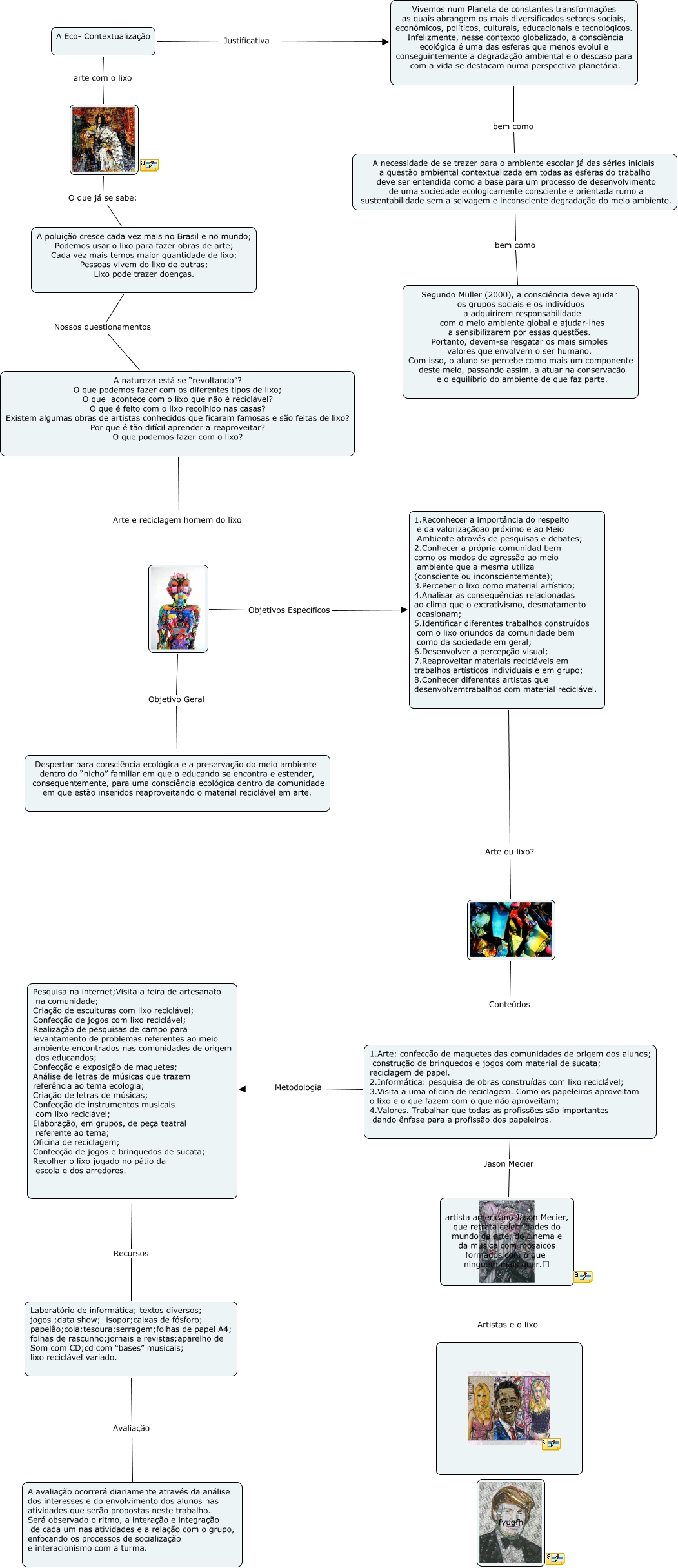Esse mapa conceitual, produzido no IHMC CmapTools, tem a informação relacionada a: Eco-contextualização, 1.Arte: confecção de maquetes das comunidades de origem dos alunos; construção de brinquedos e jogos com material de sucata; reciclagem de papel. 2.Informática: pesquisa de obras construídas com lixo reciclável; 3.Visita a uma oficina de reciclagem. Como os papeleiros aproveitam o lixo e o que fazem com o que não aproveitam; 4.Valores. Trabalhar que todas as profissões são importantes dando ênfase para a profissão dos papeleiros. Jason Mecier artista americano Jason Mecier, que retrata celebridades do mundo da arte, do cinema e da música com mosaicos formados com o que ninguém mais quer., A necessidade de se trazer para o ambiente escolar já das séries iniciais a questão ambiental contextualizada em todas as esferas do trabalho deve ser entendida como a base para um processo de desenvolvimento de uma sociedade ecologicamente consciente e orientada rumo a sustentabilidade sem a selvagem e inconsciente degradação do meio ambiente. bem como Segundo Müller (2000), a consciência deve ajudar os grupos sociais e os indivíduos a adquirirem responsabilidade com o meio ambiente global e ajudar-lhes a sensibilizarem por essas questões. Portanto, devem-se resgatar os mais simples valores que envolvem o ser humano. Com isso, o aluno se percebe como mais um componente deste meio, passando assim, a atuar na conservação e o equilíbrio do ambiente de que faz parte., artista americano Jason Mecier, que retrata celebridades do mundo da arte, do cinema e da música com mosaicos formados com o que ninguém mais quer. Artistas e o lixo ????, 1.Reconhecer a importância do respeito e da valorizaçãoao próximo e ao Meio Ambiente através de pesquisas e debates; 2.Conhecer a própria comunidad bem como os modos de agressão ao meio ambiente que a mesma utiliza (consciente ou inconscientemente); 3.Perceber o lixo como material artístico; 4.Analisar as consequências relacionadas ao clima que o extrativismo, desmatamento ocasionam; 5.Identificar diferentes trabalhos construídos com o lixo oriundos da comunidade bem como da sociedade em geral; 6.Desenvolver a percepção visual; 7.Reaproveitar materiais recicláveis em trabalhos artísticos individuais e em grupo; 8.Conhecer diferentes artistas que desenvolvemtrabalhos com material reciclável. Arte ou lixo? ????, ???? Objetivo Geral Despertar para consciência ecológica e a preservação do meio ambiente dentro do “nicho” familiar em que o educando se encontra e estender, consequentemente, para uma consciência ecológica dentro da comunidade em que estão inseridos reaproveitando o material reciclável em arte., Vivemos num Planeta de constantes transformações as quais abrangem os mais diversificados setores sociais, econômicos, políticos, culturais, educacionais e tecnológicos. Infelizmente, nesse contexto globalizado, a consciência ecológica é uma das esferas que menos evolui e conseguintemente a degradação ambiental e o descaso para com a vida se destacam numa perspectiva planetária. bem como A necessidade de se trazer para o ambiente escolar já das séries iniciais a questão ambiental contextualizada em todas as esferas do trabalho deve ser entendida como a base para um processo de desenvolvimento de uma sociedade ecologicamente consciente e orientada rumo a sustentabilidade sem a selvagem e inconsciente degradação do meio ambiente., A Eco- Contextualização arte com o lixo ????, A natureza está se “revoltando”? O que podemos fazer com os diferentes tipos de lixo; O que acontece com o lixo que não é reciclável? O que é feito com o lixo recolhido nas casas? Existem algumas obras de artistas conhecidos que ficaram famosas e são feitas de lixo? Por que é tão difícil aprender a reaproveitar? O que podemos fazer com o lixo? Arte e reciclagem homem do lixo ????, ???? ???? fyugfh, A Eco- Contextualização Justificativa Vivemos num Planeta de constantes transformações as quais abrangem os mais diversificados setores sociais, econômicos, políticos, culturais, educacionais e tecnológicos. Infelizmente, nesse contexto globalizado, a consciência ecológica é uma das esferas que menos evolui e conseguintemente a degradação ambiental e o descaso para com a vida se destacam numa perspectiva planetária., Laboratório de informática; textos diversos; jogos ;data show; isopor;caixas de fósforo; papelão;cola;tesoura;serragem;folhas de papel A4; folhas de rascunho;jornais e revistas;aparelho de Som com CD;cd com “bases” musicais; lixo reciclável variado. Avaliação A avaliação ocorrerá diariamente através da análise dos interesses e do envolvimento dos alunos nas atividades que serão propostas neste trabalho. Será observado o ritmo, a interação e integração de cada um nas atividades e a relação com o grupo, enfocando os processos de socialização e interacionismo com a turma., A poluição cresce cada vez mais no Brasil e no mundo; Podemos usar o lixo para fazer obras de arte; Cada vez mais temos maior quantidade de lixo; Pessoas vivem do lixo de outras; Lixo pode trazer doenças. Nossos questionamentos A natureza está se “revoltando”? O que podemos fazer com os diferentes tipos de lixo; O que acontece com o lixo que não é reciclável? O que é feito com o lixo recolhido nas casas? Existem algumas obras de artistas conhecidos que ficaram famosas e são feitas de lixo? Por que é tão difícil aprender a reaproveitar? O que podemos fazer com o lixo?, ???? Objetivos Específicos 1.Reconhecer a importância do respeito e da valorizaçãoao próximo e ao Meio Ambiente através de pesquisas e debates; 2.Conhecer a própria comunidad bem como os modos de agressão ao meio ambiente que a mesma utiliza (consciente ou inconscientemente); 3.Perceber o lixo como material artístico; 4.Analisar as consequências relacionadas ao clima que o extrativismo, desmatamento ocasionam; 5.I