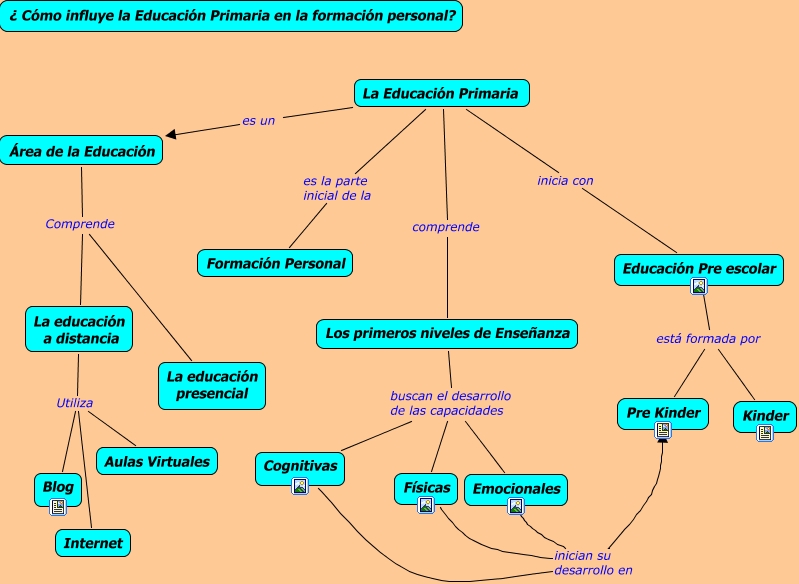 Este Cmap, tiene información relacionada con: Educación Primaria, La Educación Primaria comprende Los primeros niveles de Enseñanza, Físicas inician su desarrollo en Pre Kinder, Cognitivas inician su desarrollo en Pre Kinder, Los primeros niveles de Enseñanza buscan el desarrollo de las capacidades Cognitivas, La Educación Primaria es un Área de la Educación, Área de la Educación Comprende La educación a distancia, Emocionales inician su desarrollo en Pre Kinder, La educación a distancia Utiliza Aulas Virtuales, Los primeros niveles de Enseñanza buscan el desarrollo de las capacidades Físicas, Educación Pre escolar está formada por Kinder, La educación a distancia Utiliza Internet, Educación Pre escolar está formada por Pre Kinder, Los primeros niveles de Enseñanza buscan el desarrollo de las capacidades Emocionales, La Educación Primaria es la parte inicial de la Formación Personal, La Educación Primaria inicia con Educación Pre escolar, Área de la Educación Comprende La educación presencial, La educación a distancia Utiliza Blog