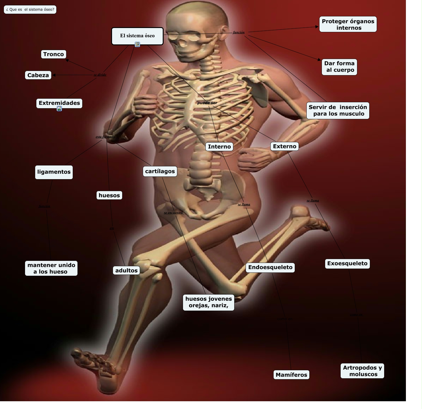 Este Cmap, tiene información relacionada con: Sistema óseo, El sistema óseo función Servir de inserción para los musculo, El sistema óseo esta formado huesos, El sistema óseo esta formado ligamentos, cartílagos se encuentra huesos jovenes orejas, nariz,, ligamentos función mantener unido a los hueso, El sistema óseo se divide Extremidades, El sistema óseo función Dar forma al cuerpo, El sistema óseo se divide Tronco, El sistema óseo esta formado cartílagos, El sistema óseo se divide Cabeza, El sistema óseo función Proteger órganos internos, Interno se llama Endoesqueleto, Endoesqueleto como en Mamíferos, Exoesqueleto como en Artropodos y moluscos, El sistema óseo puede ser Externo, El sistema óseo puede ser Interno, huesos en adultos, Externo se llama Exoesqueleto