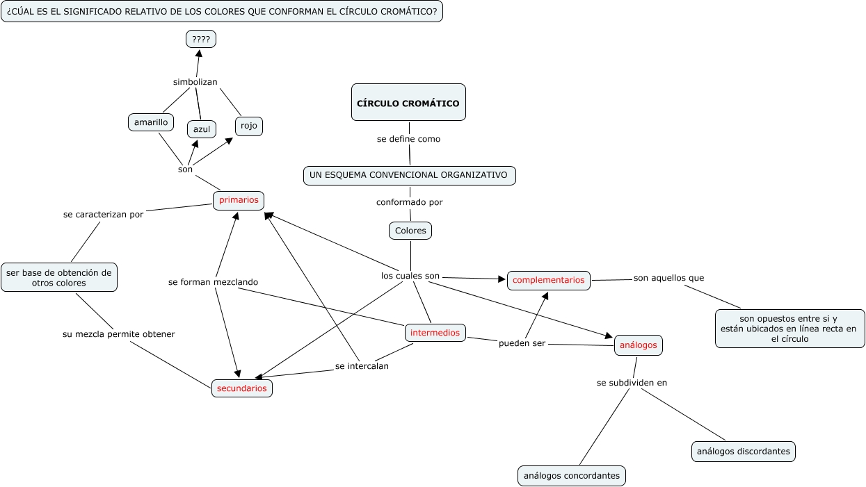 Este Cmap, tiene información relacionada con: CIRCULO CROMÁTICO, intermedios se forman mezclando secundarios, Colores los cuales son complementarios, primarios se caracterizan por ser base de obtención de otros colores, análogos se subdividen en análogos discordantes, ser base de obtención de otros colores su mezcla permite obtener secundarios, CÍRCULO CROMÁTICO se define como UN ESQUEMA CONVENCIONAL ORGANIZATIVO, azul simbolizan ????, amarillo simbolizan ????, intermedios pueden ser análogos, UN ESQUEMA CONVENCIONAL ORGANIZATIVO conformado por Colores, primarios son amarillo, azul simbolizan ????, intermedios se intercalan secundarios, intermedios pueden ser complementarios, Colores los cuales son primarios, análogos se subdividen en análogos concordantes, CÍRCULO CROMÁTICO UN ESQUEMA CONVENCIONAL ORGANIZATIVO, rojo simbolizan ????, primarios son azul, intermedios se intercalan primarios