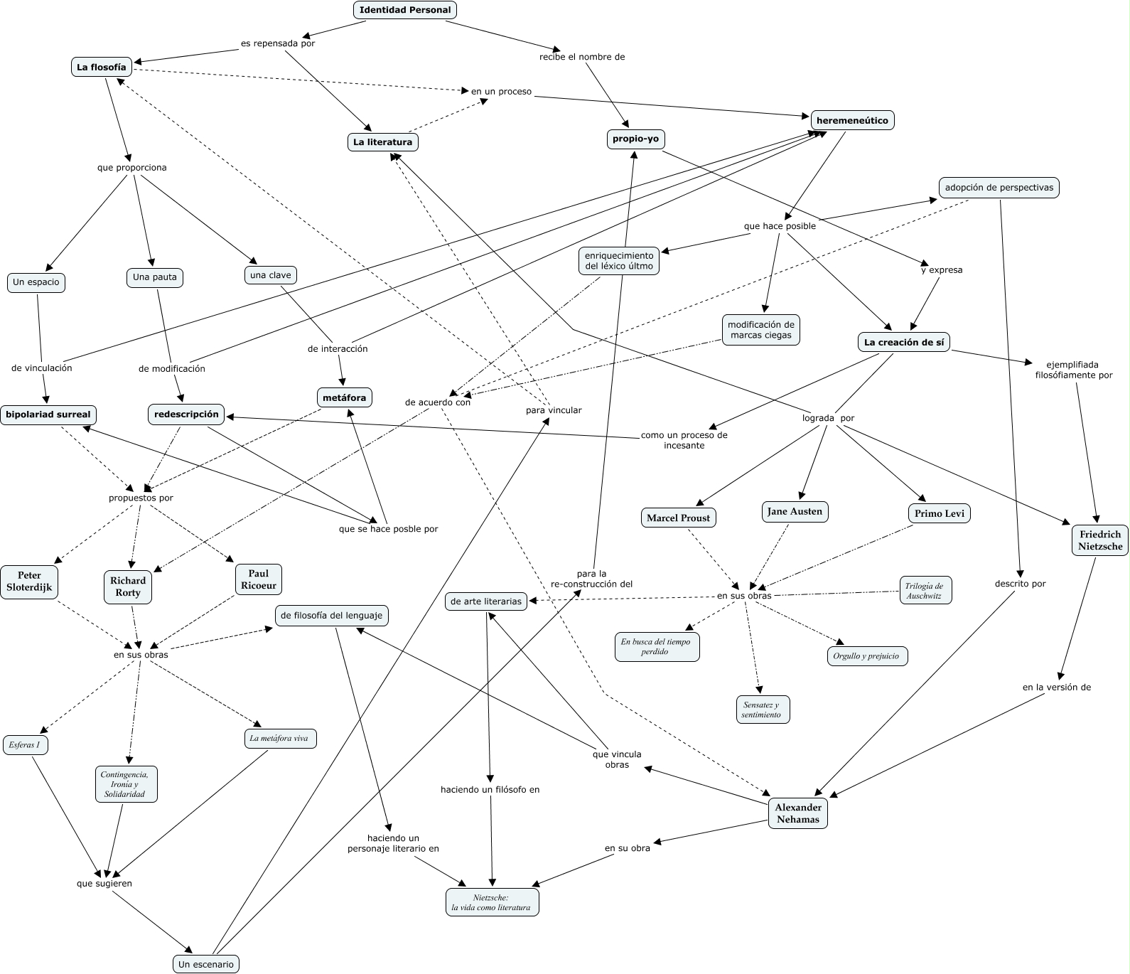 Este Cmap, tiene información relacionada con: Proyecto de la maestría, Jane Austen en sus obras Sensatez y sentimiento, Marcel Proust en sus obras Trilogía de Auschwitz, adopción de perspectivas de acuerdo con Alexander Nehamas, Primo Levi en sus obras Trilogía de Auschwitz, La creación de sí lograda por Marcel Proust, Una pauta de modificación redescripción, Identidad Personal recibe el nombre de propio-yo, La literatura en un proceso heremeneútico, modificación de marcas ciegas de acuerdo con Richard Rorty, Marcel Proust en sus obras Orgullo y prejuicio, Richard Rorty en sus obras de filosofía del lenguaje, de arte literarias haciendo un filósofo en Nietzsche: la vida como literatura, Identidad Personal es repensada por La literatura, Peter Sloterdijk en sus obras Contingencia, Ironía y Solidaridad, Un espacio de vinculación heremeneútico, La metáfora viva que sugieren Un escenario, redescripción propuestos por Paul Ricoeur, heremeneútico que hace posible La creación de sí, heremeneútico que hace posible enriquecimiento del léxico últmo, Peter Sloterdijk en sus obras Esferas I