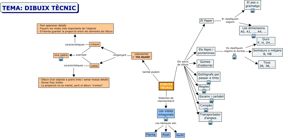 Aquest mapa conceptual conté informació relacionada amb: Dibuix Tècnic_1r ESO, DIBUIX TÈCNIC Els estris de dibuix Els llapis i portamines, DIBUIX TÈCNIC Els estris de dibuix El Paper, DIBUIX TÈCNIC també podem representar a "mà alçada", Les vistes ortogonals Les bàsiques són Alçat, esbòs característiques - Dibuix d'un objecte a grans trets i sense massa detalls - Sense ficar mides - La proporció no es manté, però el dibuix "s'enten", Els llapis i portamines Es clasifiquen segons la duresa en Tous 2B, 3B, ..., representar a "mà alçada" mitjançant esbòs, Els llapis i portamines Es clasifiquen segons la duresa en Semidurs o mitjans B, HB, Les vistes ortogonals Les bàsiques són Perfil, cròquis exemple Una cadira, DIBUIX TÈCNIC Els estris de dibuix Escaire i cartabó, DIBUIX TÈCNIC Els estris de dibuix Gomes d'esborrar, cròquis característiques - Fem apareixer detalls - Fiquem les mides més importants de l'objecte - S'intenta guardar la proporció entre els elements del dibuix, DIBUIX TÈCNIC Els estris de dibuix Transportador d'angles, DIBUIX TÈCNIC Els estris de dibuix Regles, esbòs exemple Una cadira, DIBUIX TÈCNIC Els estris de dibuix Estilògrafs per passar a tinta, DIBUIX TÈCNIC Sistemes de representació Les vistes ortogonals, DIBUIX TÈCNIC Els estris de dibuix Compàs, representar a "mà alçada" mitjançant cròquis