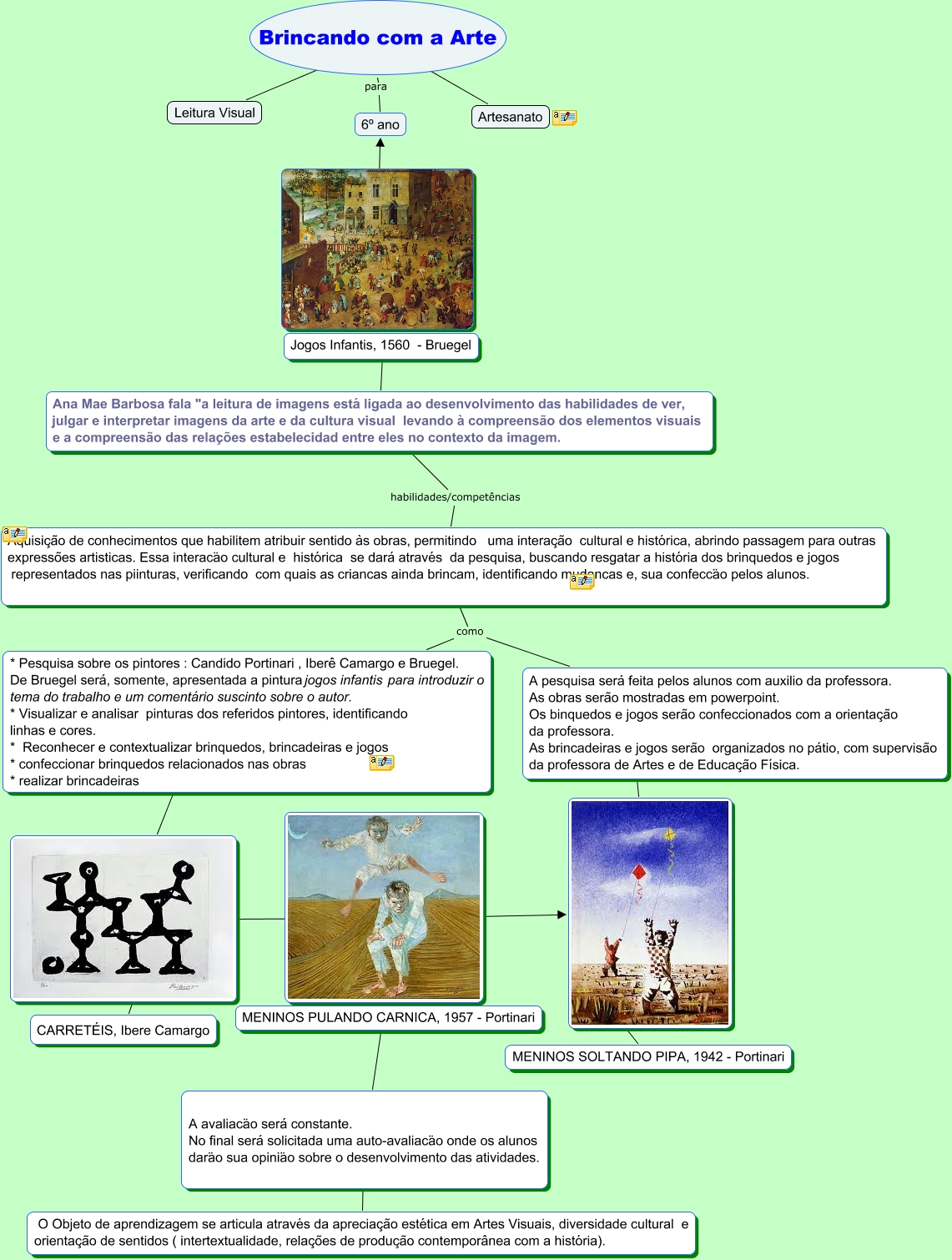 Esse mapa conceitual, produzido no IHMC CmapTools, tem a informação relacionada a: Objeto de Aprendizagem, ???? * Pesquisa sobre os pintores : Candido Portinari , Iberê Camargo e Bruegel. De Bruegel será, somente, apresentada a pintura jogos infantis para introduzir o tema do trabalho e um comentário suscinto sobre o autor. * Visualizar e analisar pinturas dos referidos pintores, identificando linhas e cores. * Reconhecer e contextualizar brinquedos, brincadeiras e jogos * confeccionar brinquedos relacionados nas obras * realizar brincadeiras, Brincando com a Arte ???? Leitura Visual, ???? 6º ano, ???? Jogos Infantis, 1560 - Bruegel, A pesquisa será feita pelos alunos com auxilio da professora. As obras serão mostradas em powerpoint. Os binquedos e jogos serão confeccionados com a orientação da professora. As brincadeiras e jogos serão organizados no pátio, com supervisão da professora de Artes e de Educação Física. ????, ???? CARRETÉIS, Ibere Camargo, ???? MENINOS PULANDO CARNICA, 1957 - Portinari, ???? MENINOS SOLTANDO PIPA, 1942 - Portinari, Brincando com a Arte para 6º ano, ????, A avaliacäo será constante. No final será solicitada uma auto-avaliacäo onde os alunos daräo sua opiniäo sobre o desenvolvimento das atividades. ???? O Objeto de aprendizagem se articula através da apreciação estética em Artes Visuais, diversidade cultural e orientação de sentidos ( intertextualidade, relações de produção contemporânea com a história)., A pesquisa será feita pelos alunos com auxilio da professora. As obras serão mostradas em powerpoint. Os binquedos e jogos serão confeccionados com a orientação da professora. As brincadeiras e jogos serão organizados no pátio, com supervisão da professora de Artes e de Educação Física. como * Pesquisa sobre os pintores : Candido Portinari , Iberê Camargo e Bruegel. De Bruegel será, somente, apresentada a pintura jogos infantis para introduzir o tema do trabalho e um comentário suscinto sobre o autor. * Visualizar e analisar pinturas dos referidos pintores, identificando linhas e cores. * Reconhecer e contextualizar brinquedos, brincadeiras e jogos * confeccionar brinquedos relacionados nas obras * realizar brincadeiras, Ana Mae Barbosa fala "a leitura de imagens está ligada ao desenvolvimento das habilidades de ver, julgar e interpretar imagens da arte e da cultura visual levando à compreensão dos elementos visuais e a compreensão das relações estabelecidad entre eles no contexto da imagem. habilidades/competências Aquisição de conhecimentos que habilitem atribuir sentido às obras, permitindo uma interação cultural e histórica, abrindo passagem para outras expressões artisticas. Essa interacäo cultural e histórica se dará através da pesquisa, buscando resgatar a história dos brinquedos e jogos representados nas piinturas, verificando com quais as criancas ainda brincam, identificando mudancas e, sua confeccäo pelos alunos., Jogos Infantis, 1560 - Bruegel ???? Ana Mae Barbosa fala "a leitura de imagens está ligada ao desenvolvimento das habilidades de ver, julgar e interpretar imagens da arte e da cultura visual levando à compreensão dos elementos visuais e a compreensão das relações estabelecidad entre eles no contexto da imagem., MENINOS PULANDO CARNICA, 1957 - Portinari ???? A avaliacäo será constante. No final será solicitada uma auto-avaliacäo onde os alunos daräo sua opiniäo sobre o desenvolvimento das atividades., Aquisição de conhecimentos que habilitem atribuir sentido às obras, permitindo uma interação cultural e histórica, abrindo passagem para outras expressões artisticas. Essa interacäo cultural e histórica se dará através da pesquisa, buscando resgatar a história dos brinquedos e jogos representados nas piinturas, verificando com quais as criancas ainda brincam, identificando mudancas e, sua confeccäo pelos alunos. como * Pesquisa sobre os pintores : Candido Portinari , Iberê Camargo e Bruegel. De Bruegel será, somente, apresentada a pintura jogos infantis para introduzir o tema do trabalho e um comentário suscinto sobre o autor. * Visualizar e analisar pinturas dos referidos pintores, identificando linhas e cores. * Reconhecer e contextualizar brinquedos, brincadeiras e jogos * confeccionar brinquedos relacionados nas obras * realizar brincadeiras, Brincando com a Arte ???? Artesanato, ???? ???? A pesquisa será feita pelos alunos com auxilio da professora. As obras serão mostradas em powerpoint. Os binquedos e jogos serão confeccionados com a orientação da professora. As brincadeiras e jogos serão organizados no pátio, com supervisão da professora de Artes e de Educação Física.