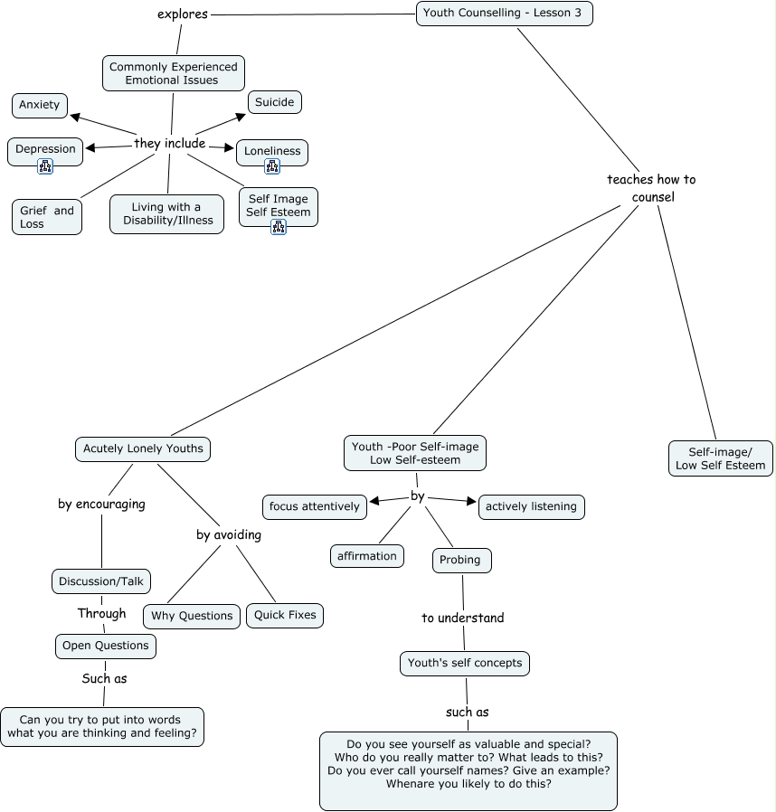 This Concept Map, created with IHMC CmapTools, has information related to: Lesson 3, Youth Counselling - Lesson 3 teaches how to counsel Self-image/ Low Self Esteem, Probing to understand Youth's self concepts, Acutely Lonely Youths by avoiding Why Questions, Youth Counselling - Lesson 3 explores Commonly Experienced Emotional Issues, Acutely Lonely Youths by avoiding Quick Fixes, Open Questions Such as Can you try to put into words what you are thinking and feeling?, Commonly Experienced Emotional Issues they include Grief and Loss, Commonly Experienced Emotional Issues they include Loneliness, Youth -Poor Self-image Low Self-esteem by affirmation, Youth -Poor Self-image Low Self-esteem by focus attentively, Youth's self concepts such as Do you see yourself as valuable and special? Who do you really matter to? What leads to this? Do you ever call yourself names? Give an example? Whenare you likely to do this?, Youth Counselling - Lesson 3 teaches how to counsel Acutely Lonely Youths, Commonly Experienced Emotional Issues they include Suicide, Youth Counselling - Lesson 3 teaches how to counsel Youth -Poor Self-image Low Self-esteem, Commonly Experienced Emotional Issues they include Living with a Disability/Illness, Discussion/Talk Through Open Questions, Youth -Poor Self-image Low Self-esteem by actively listening, Commonly Experienced Emotional Issues they include Depression, Youth -Poor Self-image Low Self-esteem by Probing, Acutely Lonely Youths by encouraging Discussion/Talk