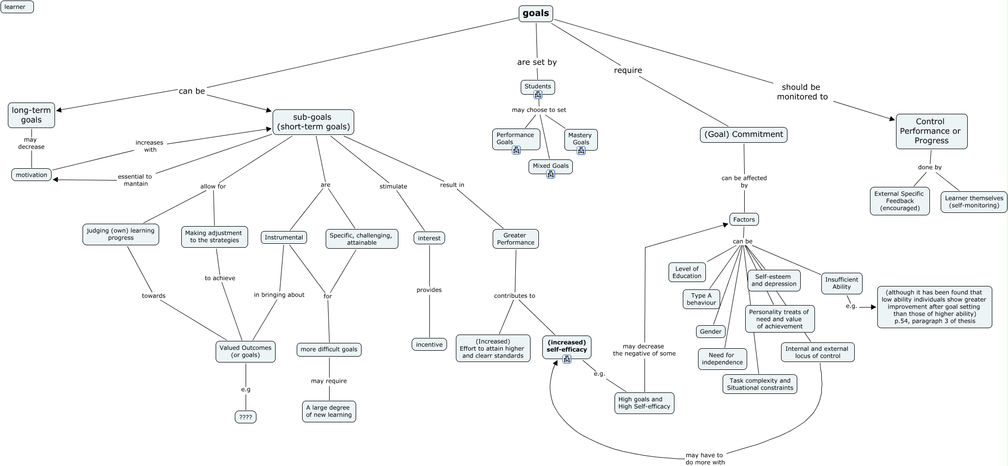 This Concept Map, created with IHMC CmapTools, has information related to: goal-setting, Factors can be Gender, (increased) self-efficacy e.g. High goals and High Self-efficacy, sub-goals (short-term goals) allow for judging (own) learning progress, goals are set by Students, Insufficient Ability e.g. (although it has been found that low ability individuals show greater improvement after goal setting than those of higher ability) p.54, paragraph 3 of thesis, sub-goals (short-term goals) result in Greater Performance, Factors can be Self-esteem and depression, Students may choose to set Performance Goals, sub-goals (short-term goals) are Instrumental, long-term goals may decrease motivation, Instrumental in bringing about Valued Outcomes (or goals), more difficult goals may require A large degree of new learning, interest provides incentive, motivation increases with sub-goals (short-term goals), Students may choose to set Mixed Goals, sub-goals (short-term goals) are Specific, challenging, attainable, judging (own) learning progress towards Valued Outcomes (or goals), High goals and High Self-efficacy may decrease the negative of some Factors, Making adjustment to the strategies to achieve Valued Outcomes (or goals), Factors can be Type A behaviour