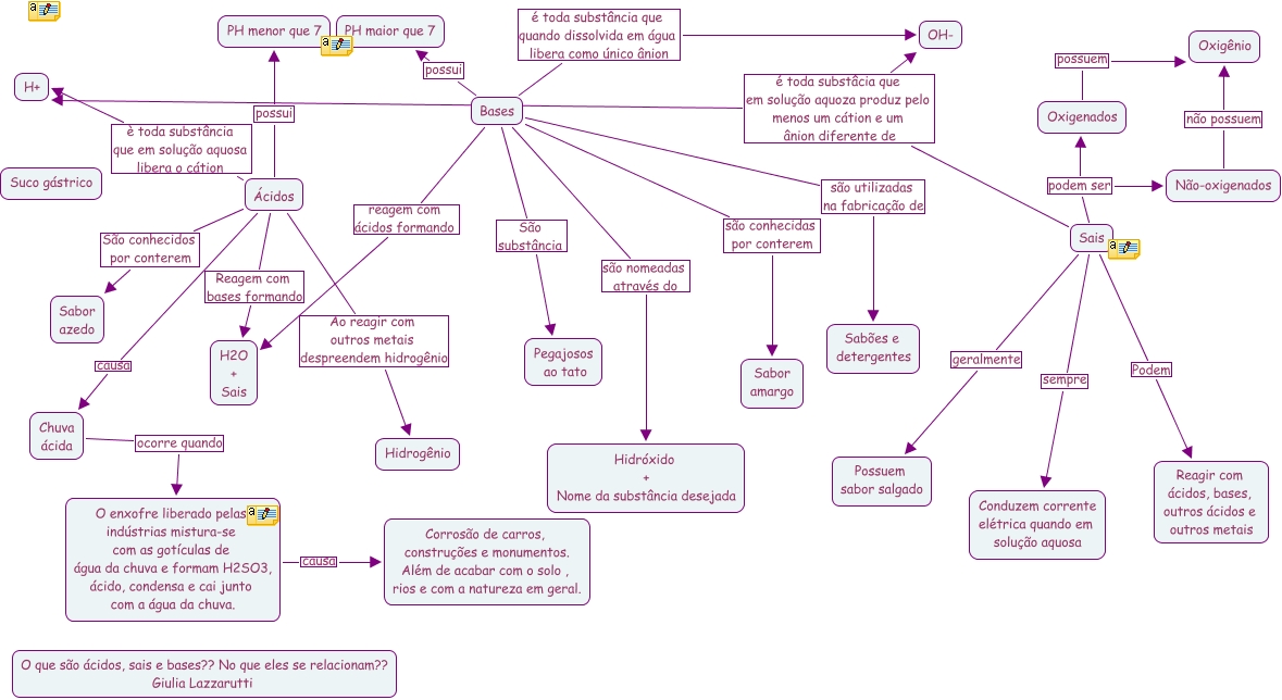This Concept Map, created with IHMC CmapTools, has information related to: Ácidos sais e bases, Bases possui PH maior que 7, Bases é toda substância que quando dissolvida em água libera como único ânion OH-, Bases são conhecidas por conterem Sabor amargo, Ácidos São conhecidos por conterem Sabor azedo, Ácidos Reagem com bases formando H2O + Sais, Sais geralmente Possuem sabor salgado, Bases são utilizadas na fabricação de Sabões e detergentes, Oxigenados possuem Oxigênio, Ácidos Ao reagir com outros metais despreendem hidrogênio Hidrogênio, O enxofre liberado pelas indústrias mistura-se com as gotículas de água da chuva e formam H2SO3, ácido, condensa e cai junto com a água da chuva. causa Corrosão de carros, construções e monumentos. Além de acabar com o solo , rios e com a natureza em geral., Sais é toda substâcia que em solução aquoza produz pelo menos um cátion e um ânion diferente de H+, Ácidos è toda substância que em solução aquosa libera o cátion H+, Bases São substância Pegajosos ao tato, Ácidos causa Chuva ácida, Sais sempre Conduzem corrente elétrica quando em solução aquosa, Ácidos possui PH menor que 7, Sais podem ser Oxigenados, Bases reagem com ácidos formando H2O + Sais, Sais podem ser Não-oxigenados, Sais é toda substâcia que em solução aquoza produz pelo menos um cátion e um ânion diferente de OH-