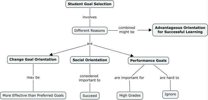 This Concept Map, created with IHMC CmapTools, has information related to: student-selection-of-goals, Social Orientation considered important to Succeed, Different Reasons are Social Orientation, Different Reasons are Performance Goals, Different Reasons are Change Goal Orientation, Student Goal Selection involves Different Reasons, Change Goal Orientation may be More Effective than Preferred Goals, Performance Goals are important for High Grades, Different Reasons combined might be Advantageous Orientation for Successful Learning, Performance Goals are hard to Ignore