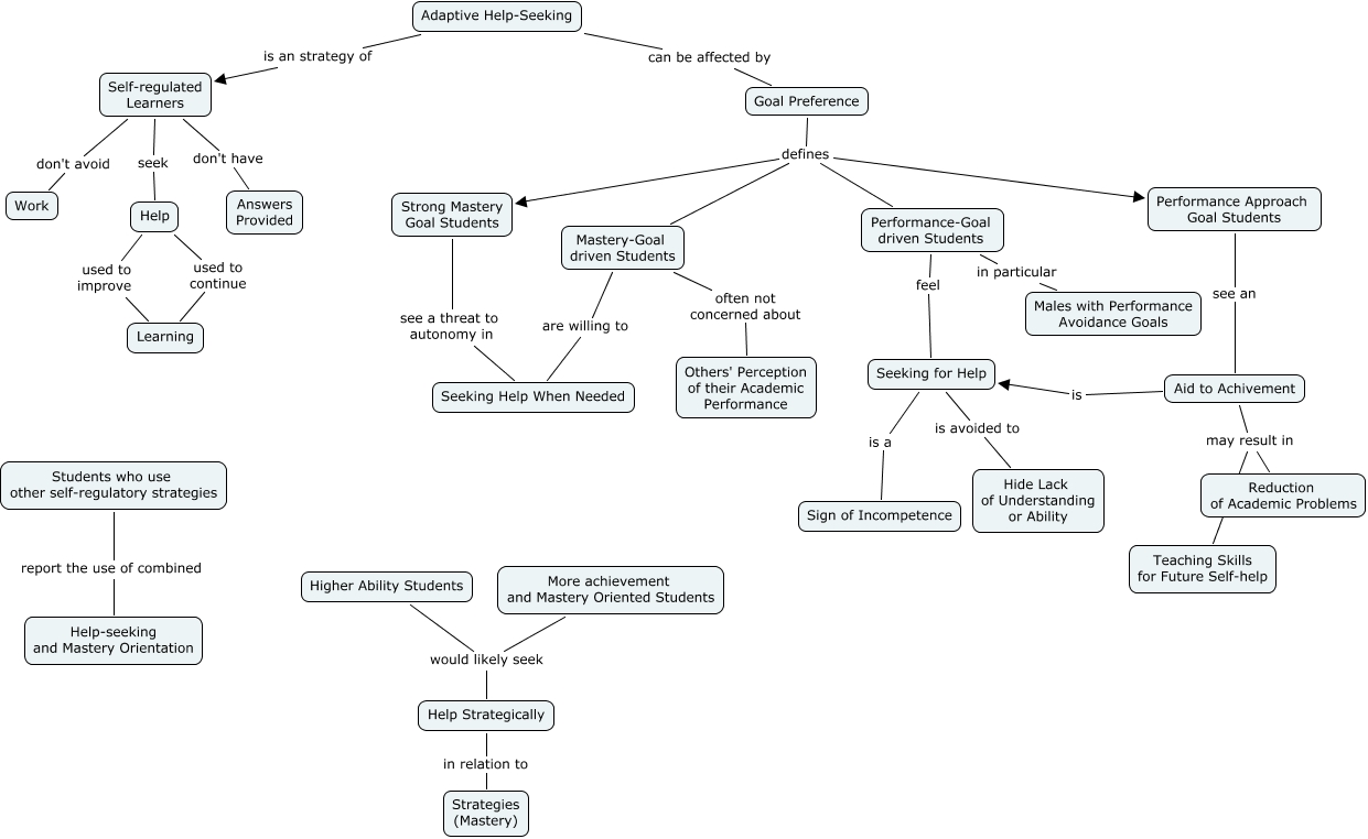 This Concept Map, created with IHMC CmapTools, has information related to: Adaptive-HelpSeeking, More achievement and Mastery Oriented Students would likely seek Help Strategically, Help used to continue Learning, Aid to Achivement is Seeking for Help, Performance-Goal driven Students in particular Males with Performance Avoidance Goals, Aid to Achivement may result in Teaching Skills for Future Self-help, Self-regulated Learners don't avoid Work, Seeking for Help is a Sign of Incompetence, Performance-Goal driven Students feel Seeking for Help, Help Strategically in relation to Strategies (Mastery), Mastery-Goal driven Students are willing to Seeking Help When Needed, Adaptive Help-Seeking can be affected by Goal Preference, Higher Ability Students would likely seek Help Strategically, Help used to improve Learning, Mastery-Goal driven Students often not concerned about Others' Perception of their Academic Performance, Adaptive Help-Seeking is an strategy of Self-regulated Learners, Students who use other self-regulatory strategies report the use of combined Help-seeking and Mastery Orientation, Self-regulated Learners seek Help, Aid to Achivement may result in Reduction of Academic Problems, Goal Preference defines Performance Approach Goal Students, Self-regulated Learners don't have Answers Provided