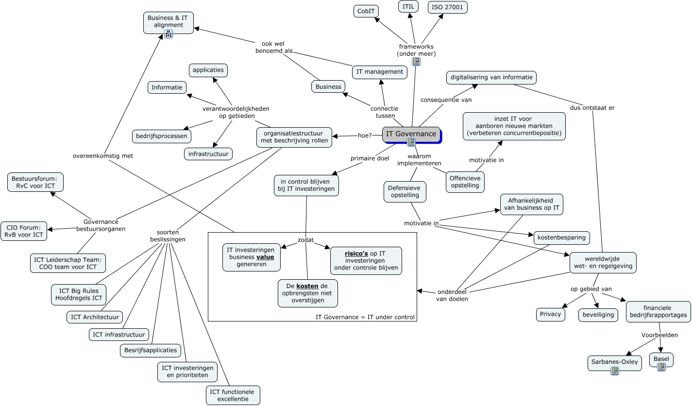 Esse mapa conceitual, produzido no IHMC CmapTools, tem a informação relacionada a: IT Governance, in control blijven bij IT investeringen zodat risico's op IT investeringen onder controle blijven, organisatiestructuur met beschrijving rollen Governance bestuursorganen CIO Forum: RvB voor ICT, organisatiestructuur met beschrijving rollen soorten beslissingen ICT functionele excellentie, organisatiestructuur met beschrijving rollen soorten beslissingen ICT Architectuur, IT Governance frameworks (onder meer) CobIT, wereldwijde wet- en regelgeving op gebied van financiele bedrijfsrapportages, in control blijven bij IT investeringen zodat De kosten de opbrengsten niet overstijgen, wereldwijde wet- en regelgeving op gebied van Privacy, Defensieve opstelling motivatie in kostenbesparing, organisatiestructuur met beschrijving rollen verantwoordelijkheden op gebieden infrastructuur, Offencieve opstelling motivatie in inzet IT voor aanboren nieuwe markten (verbeteren concurrentiepositie), Defensieve opstelling motivatie in wereldwijde wet- en regelgeving, organisatiestructuur met beschrijving rollen soorten beslissingen Besrijfsapplicaties, IT Governance = IT under control overeenkomstig met Business & IT alignment, wereldwijde wet- en regelgeving op gebied van beveiliging, IT Governance waarom implementeren Defensieve opstelling, wereldwijde wet- en regelgeving onderdeel van doelen IT Governance = IT under control, digitalisering van informatie dus ontstaat er wereldwijde wet- en regelgeving, Defensieve opstelling motivatie in Afhankelijkheid van business op IT, organisatiestructuur met beschrijving rollen verantwoordelijkheden op gebieden applicaties