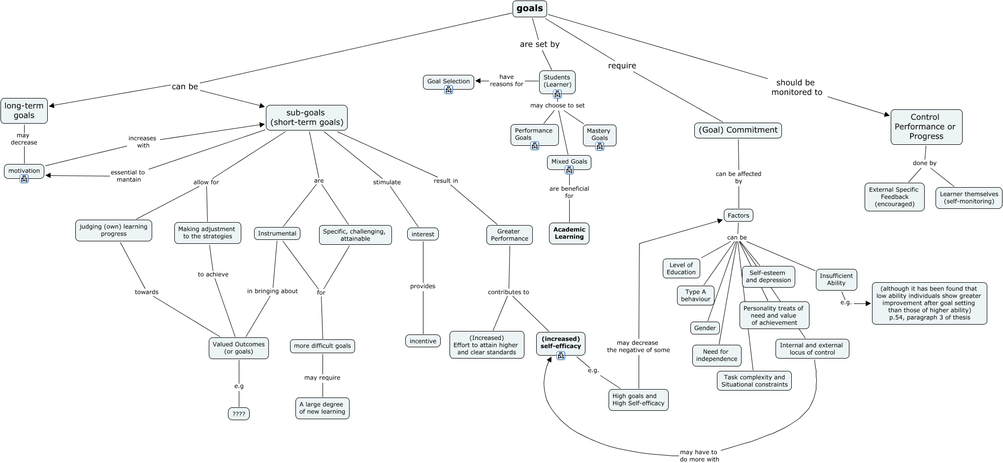 This Concept Map, created with IHMC CmapTools, has information related to: goal-setting-v2, (increased) self-efficacy e.g. High goals and High Self-efficacy, Factors can be Gender, goals are set by Students (Learner), sub-goals (short-term goals) allow for judging (own) learning progress, Factors can be Self-esteem and depression, sub-goals (short-term goals) result in Greater Performance, Insufficient Ability e.g. (although it has been found that low ability individuals show greater improvement after goal setting than those of higher ability) p.54, paragraph 3 of thesis, Students (Learner) have reasons for Goal Selection, Students (Learner) may choose to set Performance Goals, sub-goals (short-term goals) are Instrumental, Mixed Goals are beneficial for Academic Learning, Instrumental in bringing about Valued Outcomes (or goals), long-term goals may decrease motivation, more difficult goals may require A large degree of new learning, Students (Learner) may choose to set Mixed Goals, motivation increases with sub-goals (short-term goals), interest provides incentive, sub-goals (short-term goals) are Specific, challenging, attainable, judging (own) learning progress towards Valued Outcomes (or goals), High goals and High Self-efficacy may decrease the negative of some Factors