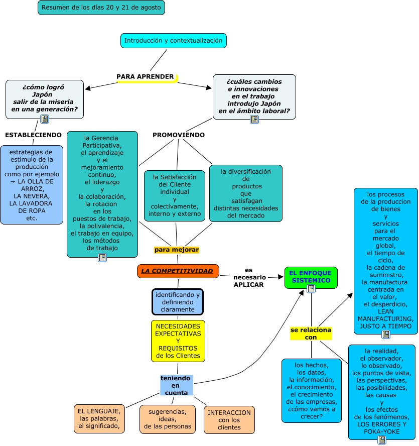 Este Cmap, tiene información relacionada con: resumen Agosto 20 y 21, EL ENFOQUE SISTEMICO se relaciona con la realidad, el observador, lo observado, los puntos de vista, las perspectivas, las posibilidades, las causas y los efectos de los fenómenos, LOS ERRORES Y POKA-YOKE, la Satisfacción del Cliente individual y colectivamente, interno y externo para mejorar LA COMPETITIVIDAD, Introducción y contextualización PARA APRENDER ¿cuáles cambios e innovaciones en el trabajo introdujo Japón en el ámbito laboral?, ¿cuáles cambios e innovaciones en el trabajo introdujo Japón en el ámbito laboral? PROMOVIENDO la Satisfacción del Cliente individual y colectivamente, interno y externo, EL ENFOQUE SISTEMICO se relaciona con los procesos de la produccion de bienes y servicios para el mercado global, el tiempo de ciclo, la cadena de suministro, la manufactura centrada en el valor, el desperdicio, LEAN MANUFACTURING, JUSTO A TIEMPO, EL ENFOQUE SISTEMICO se relaciona con los hechos, los datos, la información, el conocimiento, el crecimiento de las empresas, ¿cómo vamos a crecer?, la diversificación de productos que satisfagan distintas necesidades del mercado para mejorar LA COMPETITIVIDAD, NECESIDADES EXPECTATIVAS Y REQUISITOS de los Clientes teniendo en cuenta INTERACCION con los clientes, ¿cuáles cambios e innovaciones en el trabajo introdujo Japón en el ámbito laboral? PROMOVIENDO la diversificación de productos que satisfagan distintas necesidades del mercado, NECESIDADES EXPECTATIVAS Y REQUISITOS de los Clientes teniendo en cuenta EL LENGUAJE, las palabras, el significado,, la Gerencia Participativa, el aprendizaje y el mejoramiento continuo, el liderazgo y la colaboración, la rotacion en los puestos de trabajo, la polivalencia, el trabajo en equipo, los métodos de trabajo para mejorar LA COMPETITIVIDAD, ¿cuáles cambios e innovaciones en el trabajo introdujo Japón en el ámbito laboral? PROMOVIENDO la Gerencia Participativa, el aprendizaje y el mejoramiento continuo, el liderazgo y la colaboración, la rotacion en los puestos de trabajo, la polivalencia, el trabajo en equipo, los métodos de trabajo, ¿cómo logró Japón salir de la miseria en una generación? ESTABLECIENDO estrategias de estímulo de la producción como por ejemplo → LA OLLA DE ARROZ, LA NEVERA, LA LAVADORA DE ROPA etc., LA COMPETITIVIDAD es necesario APLICAR EL ENFOQUE SISTEMICO, Introducción y contextualización PARA APRENDER ¿cómo logró Japón salir de la miseria en una generación?, NECESIDADES EXPECTATIVAS Y REQUISITOS de los Clientes teniendo en cuenta sugerencias, ideas, de las personas, LA COMPETITIVIDAD identificando y definiendo claramente NECESIDADES EXPECTATIVAS Y REQUISITOS de los Clientes, NECESIDADES EXPECTATIVAS Y REQUISITOS de los Clientes teniendo en cuenta EL ENFOQUE SISTEMICO