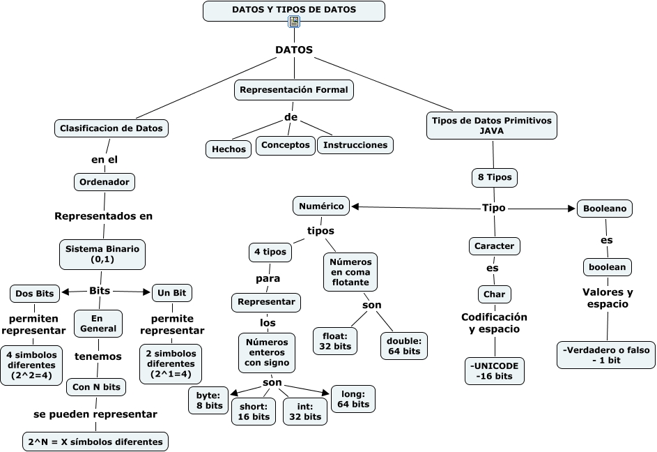 Este Cmap, tiene información relacionada con: TIPOS DE DATOS FJAVA, Tipos de Datos Primitivos JAVA Tipo Numérico, Caracter es Char, Clasificacion de Datos en el Ordenador, Números enteros con signo son byte: 8 bits, boolean Valores y espacio -Verdadero o falso - 1 bit, Tipos de Datos Primitivos JAVA Tipo Booleano, Números enteros con signo son int: 32 bits, 4 tipos para Representar, Tipos de Datos Primitivos JAVA Tipo Caracter, Números enteros con signo son short: 16 bits, Números en coma flotante son float: 32 bits, Sistema Binario (0,1) Bits Un Bit, Números en coma flotante son double: 64 bits, Un Bit permite representar 2 simbolos diferentes (2^1=4), Representar los Números enteros con signo, Números enteros con signo son long: 64 bits, DATOS Y TIPOS DE DATOS DATOS Tipos de Datos Primitivos JAVA, Ordenador Representados en Sistema Binario (0,1), Representación Formal de Conceptos, Char Codificación y espacio -UNICODE -16 bits