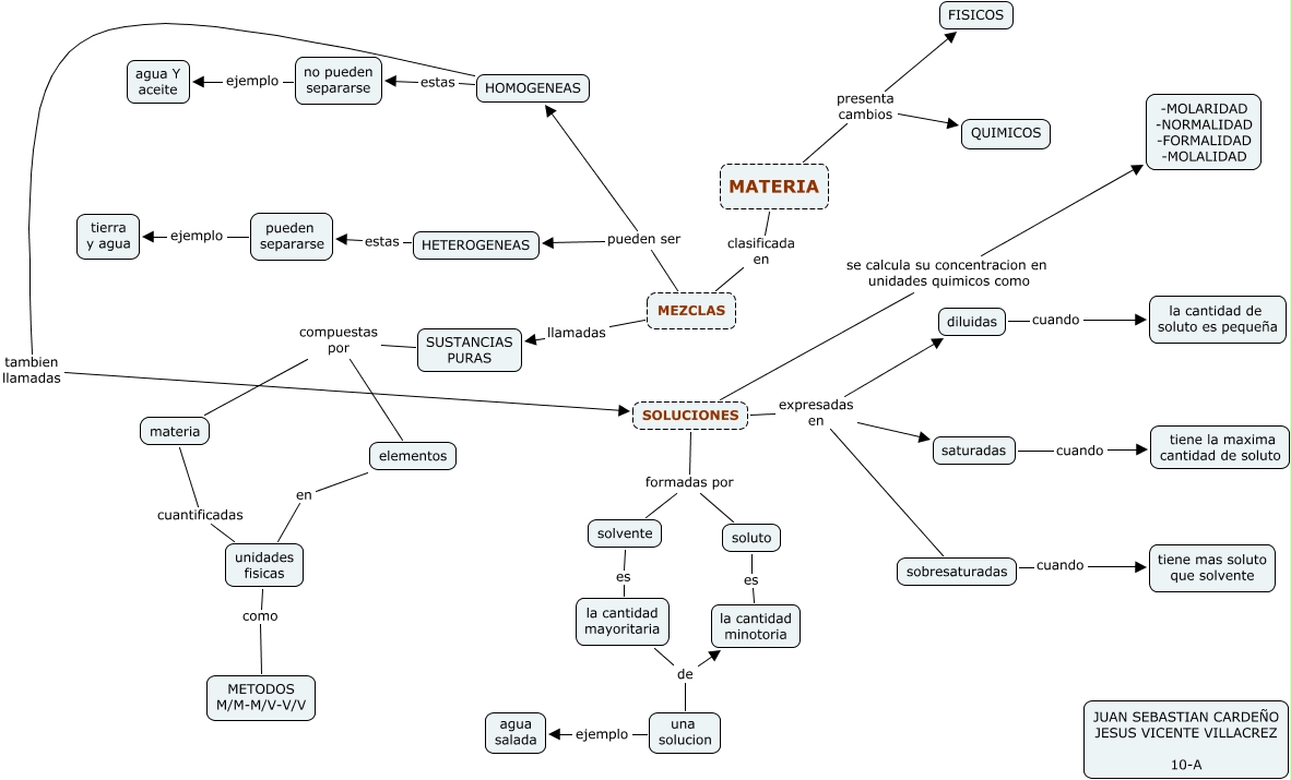 Este Cmap, tiene información relacionada con: MATERIA (solucion), la cantidad mayoritaria de la cantidad minotoria, sobresaturadas cuando tiene mas soluto que solvente, MATERIA presenta cambios QUIMICOS, MEZCLAS llamadas SUSTANCIAS PURAS, pueden separarse ejemplo tierra y agua, SOLUCIONES formadas por solvente, MATERIA presenta cambios FISICOS, SOLUCIONES se calcula su concentracion en unidades quimicos como -MOLARIDAD -NORMALIDAD -FORMALIDAD -MOLALIDAD, materia cuantificadas unidades fisicas, SOLUCIONES expresadas en diluidas, HETEROGENEAS estas pueden separarse, diluidas cuando la cantidad de soluto es pequeña, MATERIA clasificada en MEZCLAS, una solucion ejemplo agua salada, MEZCLAS pueden ser HOMOGENEAS, MEZCLAS pueden ser HETEROGENEAS, SUSTANCIAS PURAS compuestas por elementos, SOLUCIONES formadas por soluto, la cantidad mayoritaria de una solucion, SUSTANCIAS PURAS compuestas por materia