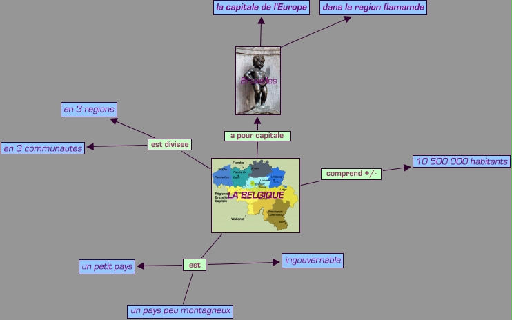 This Concept Map, created with IHMC CmapTools, has information related to: Bruxelles, LA BELGIQUE est divisee en 3 communautes, LA BELGIQUE comprend +/- 10 500 000 habitants, Bruxelles est dans la region flamamde, LA BELGIQUE est ingouvernable, LA BELGIQUE a pour capitale Bruxelles, LA BELGIQUE est un petit pays, Bruxelles est la capitale de l'Europe, LA BELGIQUE est divisee en 3 regions, LA BELGIQUE est un pays peu montagneux