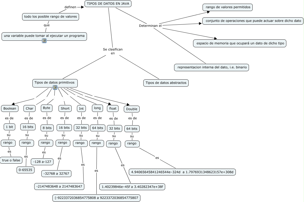 Este Cmap, tiene información relacionada con: tipos de datos, 8 bits su rango, 64 bits su rango, rango es (-9223372036854775808 a 9223372036854775807, Tipos de datos primitivos Boolean, 32 bits su rango, rango es true o false, Char es de 16 bits, Tipos de datos primitivos Double, TIPOS DE DATOS EN JAVA Determinan el rango de valores permitidos, Tipos de datos primitivos Byte, TIPOS DE DATOS EN JAVA Se clasifican en Tipos de datos abstractos, todo los posible rango de valores definen TIPOS DE DATOS EN JAVA, todo los posible rango de valores que una variable puede tomar al ejecutar un programa, 16 bits su rango, 64 bits su rango, 1 bit su rango, rango es -32768 a 32767, TIPOS DE DATOS EN JAVA Determinan el conjunto de operaciones que puede actuar sobre dicho dato, TIPOS DE DATOS EN JAVA Se clasifican en Tipos de datos primitivos, TIPOS DE DATOS EN JAVA Determinan el representacion interna del dato, i.e. binario