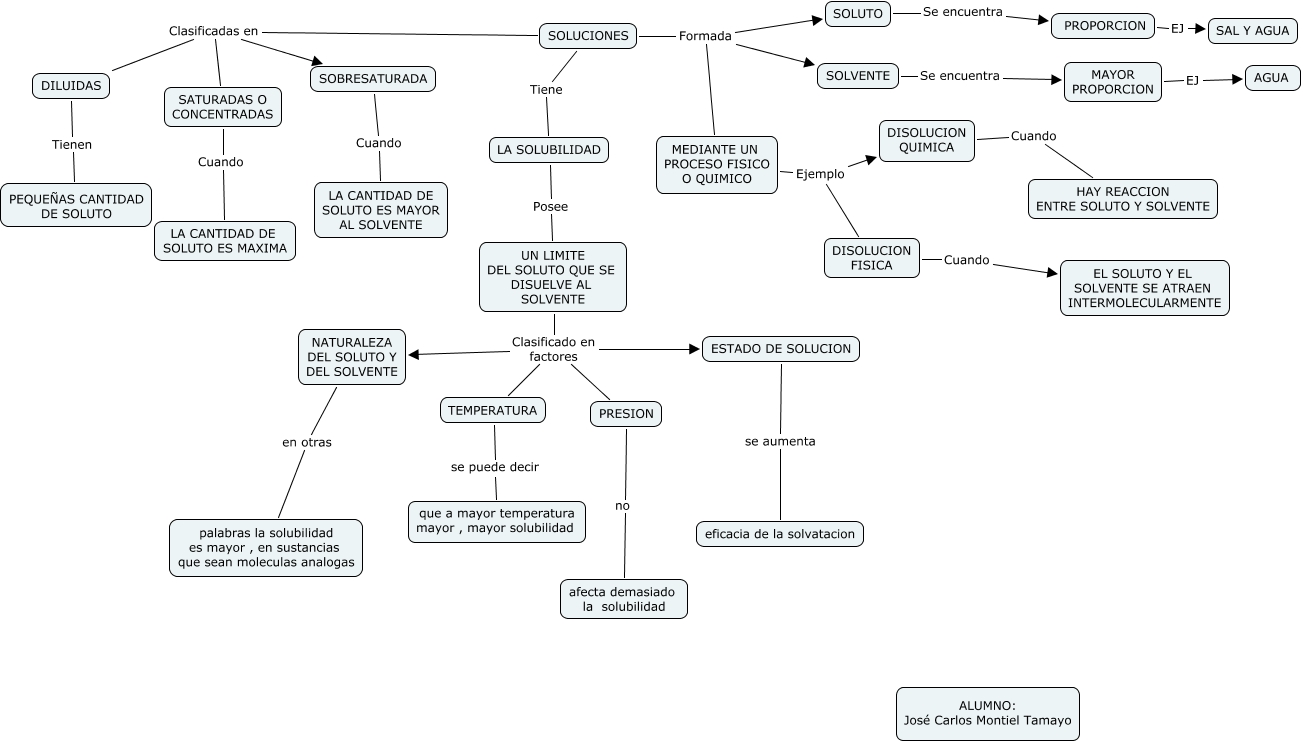 Este Cmap, tiene información relacionada con: MATERIA DAYANA JAIMEZ, SOLUCIONES Clasificadas en SATURADAS O CONCENTRADAS, PRESION no afecta demasiado la solubilidad, SOLUCIONES Formada SOLUTO, PROPORCION EJ SAL Y AGUA, SOLUCIONES Formada MEDIANTE UN PROCESO FISICO O QUIMICO, SOLVENTE Se encuentra MAYOR PROPORCION, SOLUCIONES Clasificadas en DILUIDAS, SOLUCIONES Clasificadas en SOBRESATURADA, LA SOLUBILIDAD Posee UN LIMITE DEL SOLUTO QUE SE DISUELVE AL SOLVENTE, SOLUCIONES Formada SOLVENTE, UN LIMITE DEL SOLUTO QUE SE DISUELVE AL SOLVENTE Clasificado en factores NATURALEZA DEL SOLUTO Y DEL SOLVENTE, ESTADO DE SOLUCION se aumenta eficacia de la solvatacion, DISOLUCION FISICA Cuando EL SOLUTO Y EL SOLVENTE SE ATRAEN INTERMOLECULARMENTE, NATURALEZA DEL SOLUTO Y DEL SOLVENTE en otras palabras la solubilidad es mayor , en sustancias que sean moleculas analogas, SOLUTO Se encuentra PROPORCION, DILUIDAS Tienen PEQUEÑAS CANTIDAD DE SOLUTO, SOBRESATURADA Cuando LA CANTIDAD DE SOLUTO ES MAYOR AL SOLVENTE, UN LIMITE DEL SOLUTO QUE SE DISUELVE AL SOLVENTE Clasificado en factores TEMPERATURA, TEMPERATURA se puede decir que a mayor temperatura mayor , mayor solubilidad, UN LIMITE DEL SOLUTO QUE SE DISUELVE AL SOLVENTE Clasificado en factores PRESION