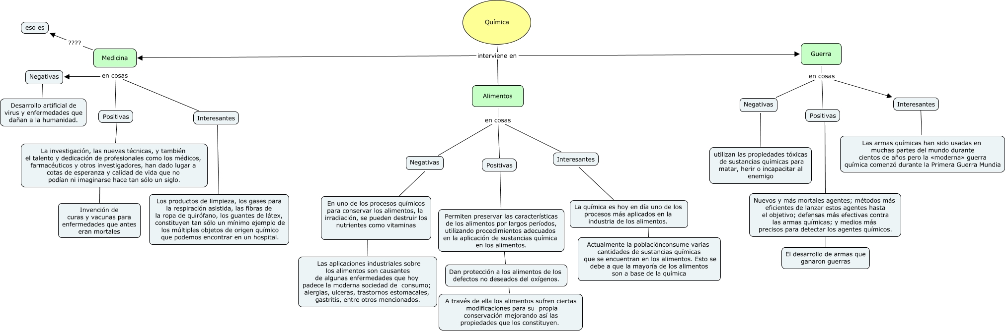 Este Cmap, tiene información relacionada con: quimica, Medicina en cosas Positivas, Permiten preservar las características de los alimentos por largos períodos, utilizando procedimientos adecuados en la aplicación de sustancias química en los alimentos. ???? Dan protección a los alimentos de los defectos no deseados del oxígenos., Positivas como Permiten preservar las características de los alimentos por largos períodos, utilizando procedimientos adecuados en la aplicación de sustancias química en los alimentos., Alimentos en cosas Negativas, Medicina ???? eso es, La investigación, las nuevas técnicas, y también el talento y dedicación de profesionales como los médicos, farmacéuticos y otros investigadores, han dado lugar a cotas de esperanza y calidad de vida que no podían ni imaginarse hace tan sólo un siglo. ???? Invención de curas y vacunas para enfermedades que antes eran mortales, Nuevos y más mortales agentes; métodos más eficientes de lanzar estos agentes hasta el objetivo; defensas más efectivas contra las armas químicas; y medios más precisos para detectar los agentes químicos. ???? El desarrollo de armas que ganaron guerras, Interesantes ???? Los productos de limpieza, los gases para la respiración asistida, las fibras de la ropa de quirófano, los guantes de látex, constituyen tan sólo un mínimo ejemplo de los múltiples objetos de origen químico que podemos encontrar en un hospital., Negativas ???? utilizan las propiedades tóxicas de sustancias químicas para matar, herir o incapacitar al enemigo, Interesantes ???? Las armas químicas han sido usadas en muchas partes del mundo durante cientos de años pero la «moderna» guerra química comenzó durante la Primera Guerra Mundia, Dan protección a los alimentos de los defectos no deseados del oxígenos. ???? A través de ella los alimentos sufren ciertas modificaciones para su propia conservación mejorando así las propiedades que los constituyen., Positivas ???? La investigación, las nuevas técnicas, y también el talento y dedicación de profesionales como los médicos, farmacéuticos y otros investigadores, han dado lugar a cotas de esperanza y calidad de vida que no podían ni imaginarse hace tan sólo un siglo., Guerra en cosas Negativas, Química interviene en Guerra, Negativas ???? Desarrollo artificial de virus y enfermedades que dañan a la humanidad., Química interviene en Medicina, Guerra en cosas Interesantes, En uno de los procesos químicos para conservar los alimentos, la irradiación, se pueden destruir los nutrientes como vitaminas ???? Las aplicaciones industriales sobre los alimentos son causantes de algunas enfermedades que hoy padece la moderna sociedad de consumo; alergias, ulceras, trastornos estomacales, gastritis, entre otros mencionados., Medicina en cosas Negativas, Alimentos en cosas Positivas