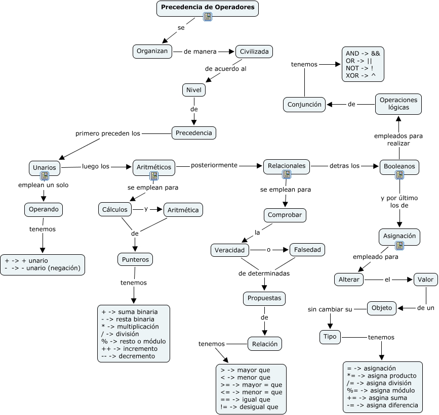 Este Cmap, tiene información relacionada con: Precedencia_de_Operadores, Aritméticos posteriormente Relacionales, Falsedad de determinadas Propuestas, Nivel de Precedencia, Propuestas de Relación, Booleanos y por último los de Asignación, Organizan de manera Civilizada, Unarios emplean un solo Operando, Asignación empleado para Alterar, Valor de un Objeto, Conjunción tenemos AND -> && OR -> || NOT -> ! XOR -> ^, Operaciones lógicas de Conjunción, Relacionales se emplean para Comprobar, Aritmética de Punteros, Relacionales detras los Booleanos, Unarios luego los Aritméticos, Veracidad de determinadas Propuestas, Operando tenemos + -> + unario - -> - unario (negación), Civilizada de acuerdo al Nivel, Aritméticos se emplean para Cálculos, Comprobar la Veracidad