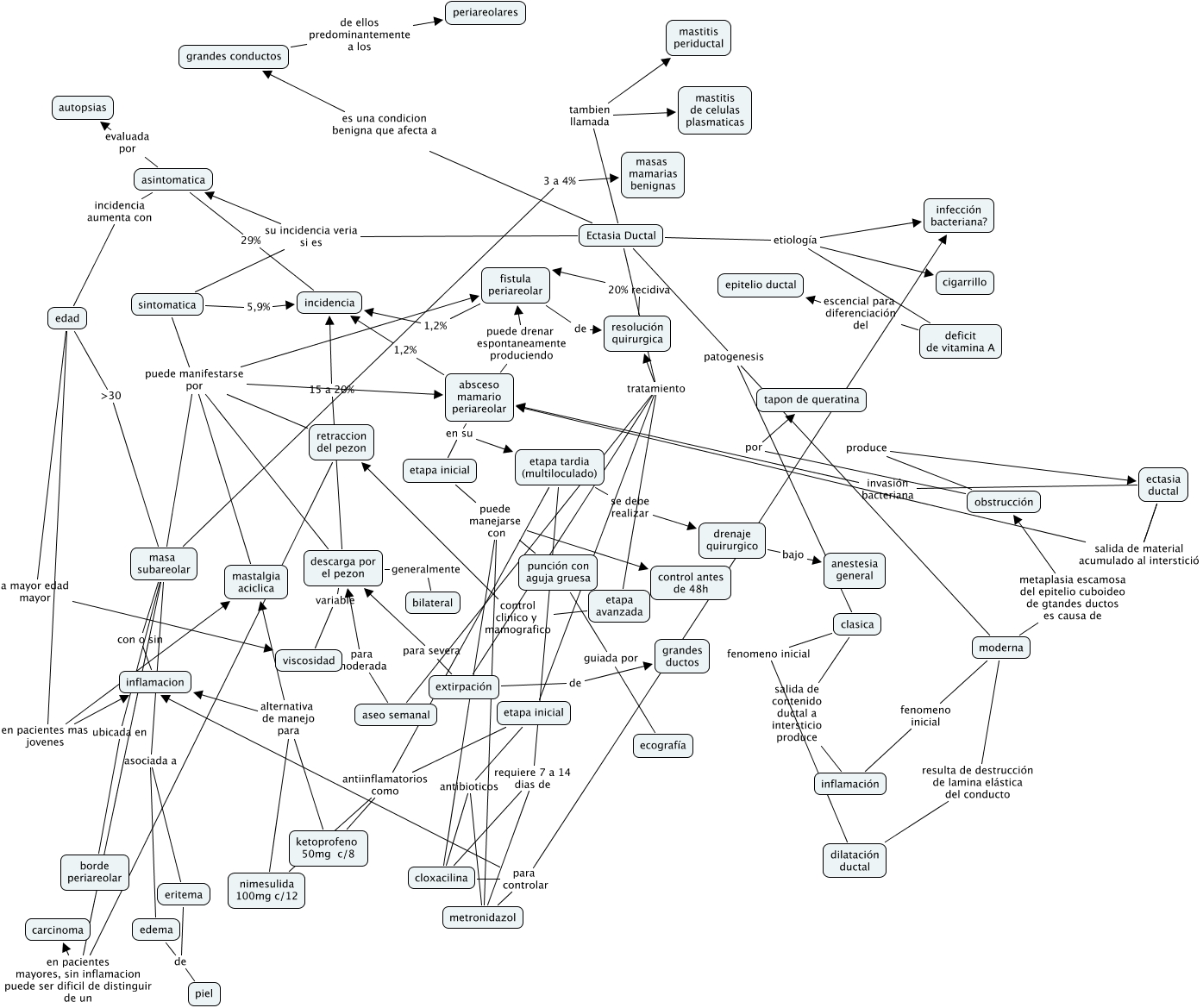 Este Cmap, tiene información relacionada con: ectasia ductal, Ectasia Ductal patogenesis clasica, etapa inicial puede manejarse con control antes de 48h, Ectasia Ductal tratamiento resolución quirurgica, extirpación para severa descarga por el pezon, etapa tardia (multiloculado) antiinflamatorios como ketoprofeno 50mg c/8, sintomatica puede manifestarse por masa subareolar, asintomatica evaluada por autopsias, sintomatica puede manifestarse por absceso mamario periareolar, etapa tardia (multiloculado) se debe realizar drenaje quirurgico, etapa tardia (multiloculado) requiere 7 a 14 dias de metronidazol, eritema de piel, aseo semanal para moderada descarga por el pezon, etapa inicial antiinflamatorios como nimesulida 100mg c/12, retraccion del pezon en pacientes mayores, sin inflamacion puede ser dificil de distinguir de un carcinoma, descarga por el pezon variable viscosidad, metronidazol para controlar infección bacteriana?, etapa inicial antiinflamatorios como ketoprofeno 50mg c/8, Ectasia Ductal tratamiento etapa avanzada, masa subareolar en pacientes mayores, sin inflamacion puede ser dificil de distinguir de un carcinoma, edad en pacientes mas jovenes inflamacion