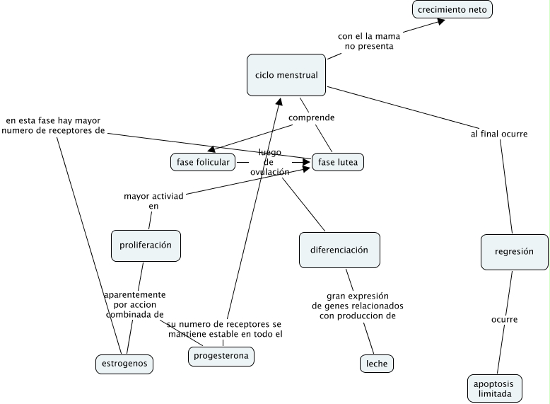 Este Cmap, tiene información relacionada con: mama y ciclo menstrual, fase folicular luego de ovulación diferenciación, fase lutea en esta fase hay mayor numero de receptores de estrogenos, ciclo menstrual al final ocurre regresión, proliferación mayor activiad en fase lutea, fase folicular luego de ovulación fase lutea, progesterona su numero de receptores se mantiene estable en todo el ciclo menstrual, diferenciación gran expresión de genes relacionados con produccion de leche, regresión ocurre apoptosis limitada, ciclo menstrual con el la mama no presenta crecimiento neto, ciclo menstrual comprende fase folicular, proliferación aparentemente por accion combinada de estrogenos, ciclo menstrual comprende fase lutea, proliferación aparentemente por accion combinada de progesterona