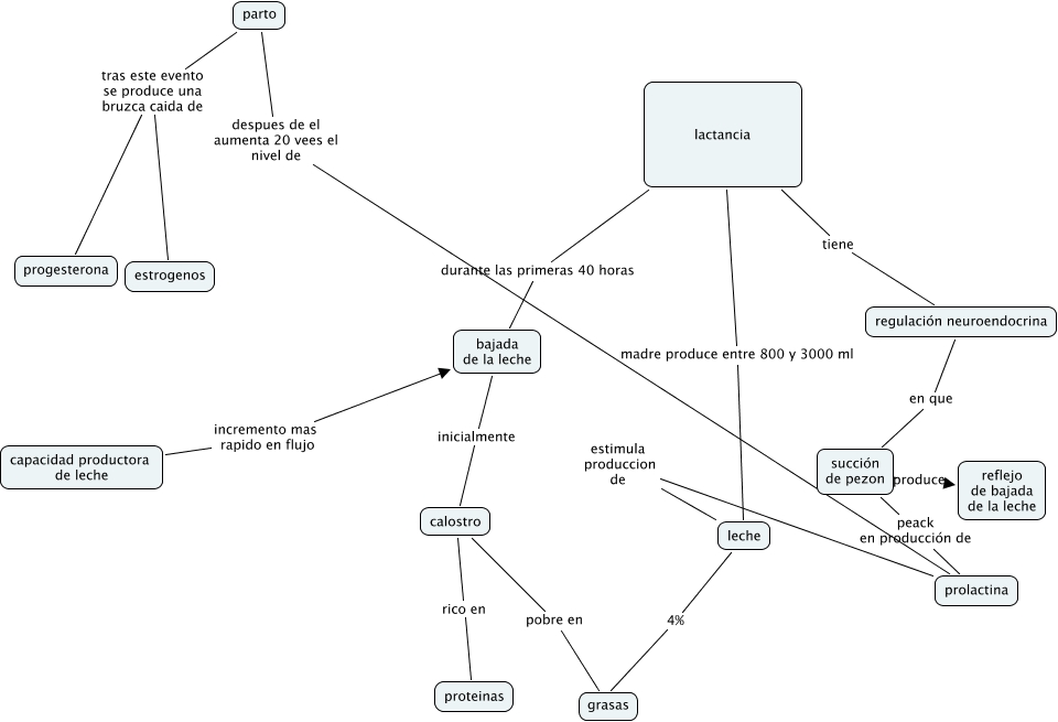 Este Cmap, tiene información relacionada con: mama y lactancia, regulación neuroendocrina en que succión de pezon, prolactina estimula produccion de leche, lactancia madre produce entre 800 y 3000 ml leche, leche 4% grasas, parto despues de el aumenta 20 vees el nivel de prolactina, calostro pobre en grasas, parto tras este evento se produce una bruzca caida de estrogenos, bajada de la leche inicialmente calostro, capacidad productora de leche incremento mas rapido en flujo bajada de la leche, lactancia tiene regulación neuroendocrina, succión de pezon produce reflejo de bajada de la leche, lactancia durante las primeras 40 horas bajada de la leche, succión de pezon peack en producción de prolactina, calostro rico en proteinas, parto tras este evento se produce una bruzca caida de progesterona