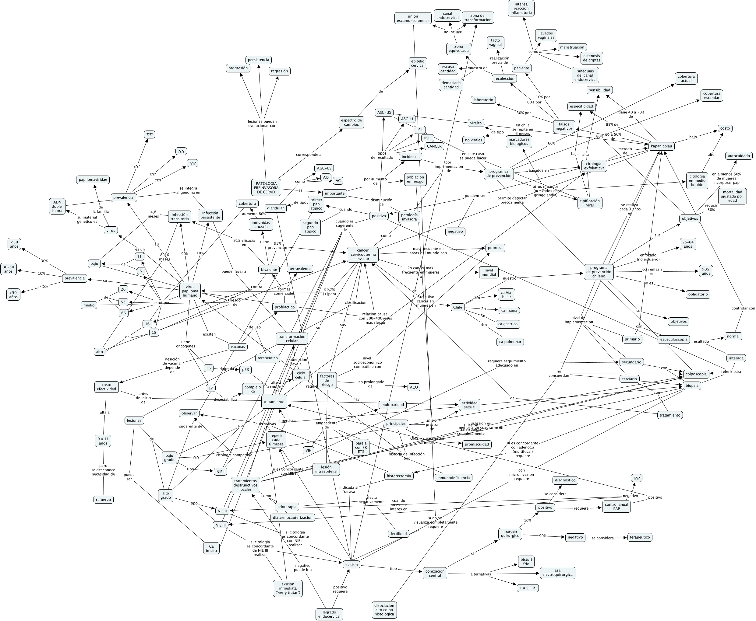 Este Cmap, tiene información relacionada con: patología preinvasora de cervix, recolección muestra de escasa cantidad, marcadores biologicos de tipo no virales, glandular como AC, especuloscopía resultado normal, 9 a 11 años pero se desconoce necesidad de refuerzo, histerectomia cuando no existe interes en fertilidad, positivo tipos de resultado ASC-US, programa de prevención chileno sus objetivos, disociación cito colpo histologica no concuerdan Papanicolau, Chile 2o ca mama, Papanicolau permite detectar precozmente cancer cervicouterino invasor, zona equivocada no incluye canal endocervical, conizacion central alternativas bisturi frio, negativo se considera terapeutico, falsos negativos 30% por laboratorio, profilactico formas comerciales tetravalente, tratamiento alternativas histerectomia, tratamientos destruuctivos locales requiere seguimiento adecuado en secundario, importante por aumento de población en riesgo, factores de riesgo antecedente de pareja con FR ETS