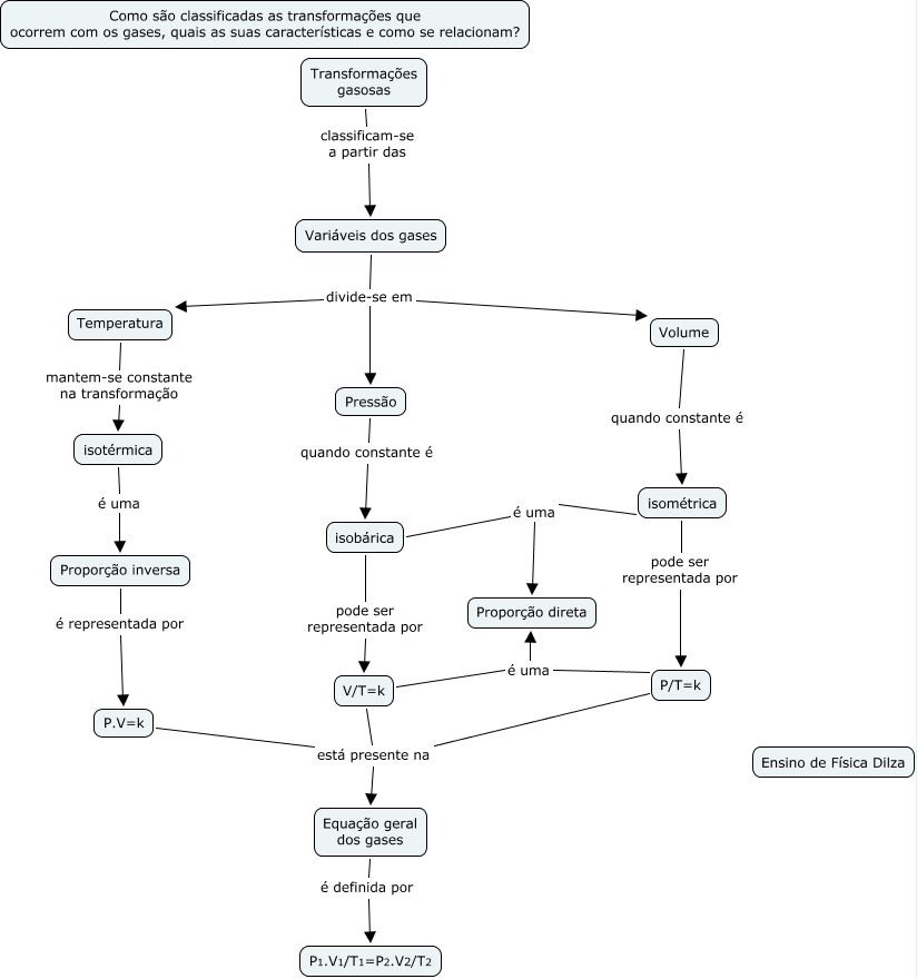 Esse mapa conceitual, produzido no IHMC CmapTools, tem a informação relacionada a: Transformações Gasosas 2B.cmap, Equação geral dos gases é definida por P1.V1/T1=P2.V2/T2, Variáveis dos gases divide-se em Volume, Proporção inversa é representada por P.V=k, Volume quando constante é isométrica, Variáveis dos gases divide-se em Pressão, isométrica pode ser representada por P/T=k, isométrica é uma Proporção direta, isobárica pode ser representada por V/T=k, Transformações gasosas classificam-se a partir das Variáveis dos gases, P/T=k é uma Proporção direta, P/T=k está presente na Equação geral dos gases, Pressão quando constante é isobárica, P.V=k está presente na Equação geral dos gases, V/T=k é uma Proporção direta, V/T=k está presente na Equação geral dos gases, isobárica é uma Proporção direta, Temperatura mantem-se constante na transformação isotérmica, isotérmica é uma Proporção inversa, Variáveis dos gases divide-se em Temperatura