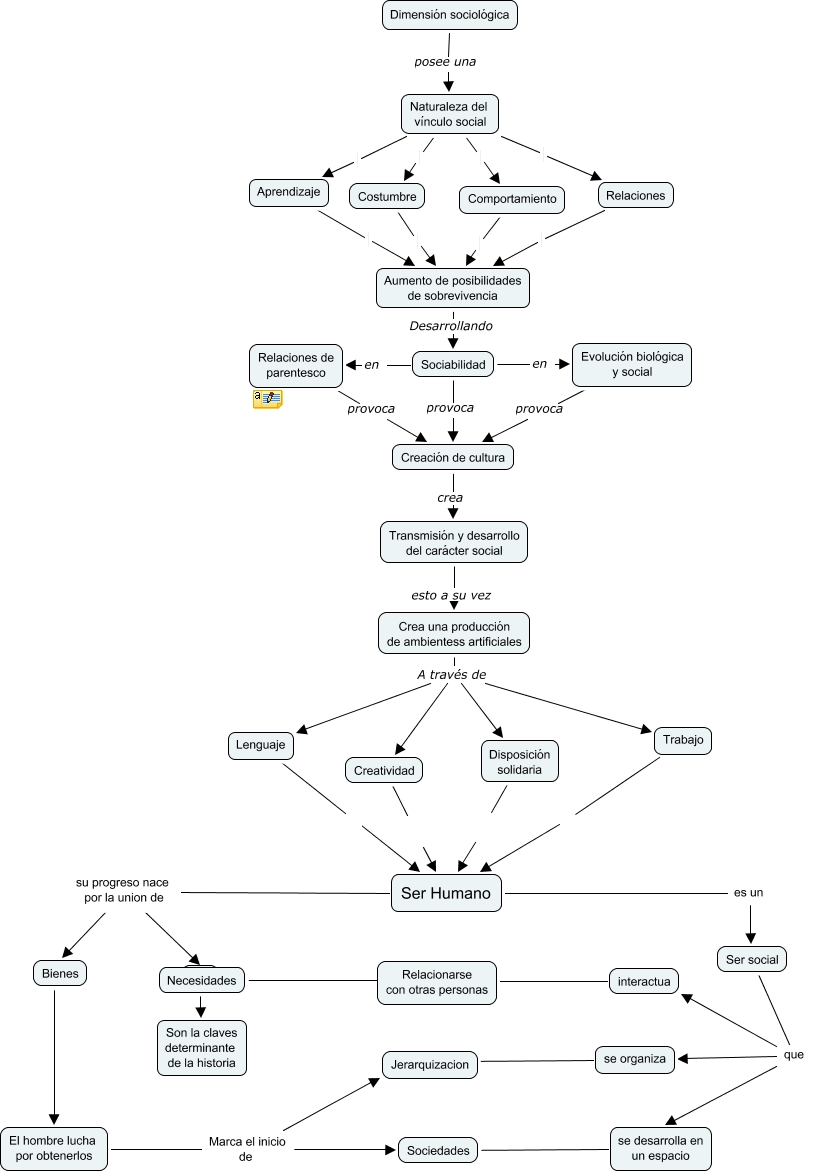 Este Cmap, tiene información relacionada con: proyecto, se desarrolla en un espacio ???? Sociedades, Crea una producción de ambientess artificiales A través de Trabajo, Relaciones Aumento de posibilidades de sobrevivencia, Creatividad Ser Humano, Dimensión sociológica posee una Naturaleza del vínculo social, Necesidades ???? Relacionarse con otras personas, Crea una producción de ambientess artificiales A través de Disposición solidaria, Aumento de posibilidades de sobrevivencia Desarrollando Sociabilidad, Ser social que se desarrolla en un espacio, Comportamiento Aumento de posibilidades de sobrevivencia, Crea una producción de ambientess artificiales A través de Lenguaje, Naturaleza del vínculo social Comportamiento, Sociabilidad provoca Creación de cultura, Creación de cultura crea Transmisión y desarrollo del carácter social, Disposición solidaria Ser Humano, Relaciones de parentesco provoca Creación de cultura, Naturaleza del vínculo social Costumbre, Costumbre Aumento de posibilidades de sobrevivencia, Naturaleza del vínculo social Relaciones, Bienes ???? El hombre lucha por obtenerlos