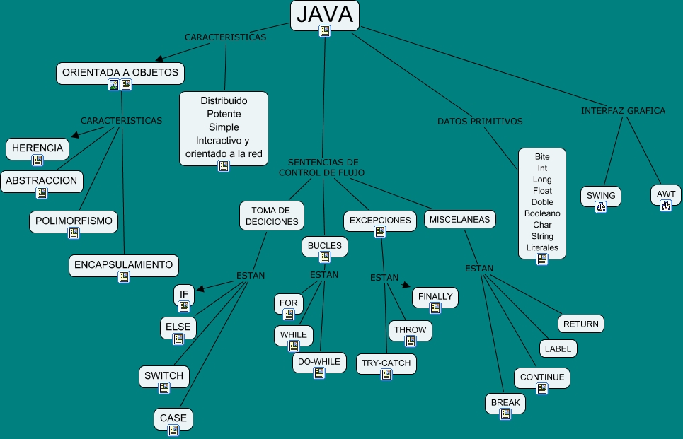 Este Cmap, tiene información relacionada con: JAVA, TOMA DE DECICIONES ESTAN SWITCH, JAVA SENTENCIAS DE CONTROL DE FLUJO MISCELANEAS, JAVA SENTENCIAS DE CONTROL DE FLUJO TOMA DE DECICIONES, ORIENTADA A OBJETOS CARACTERISTICAS ABSTRACCION, BUCLES ESTAN DO-WHILE, BUCLES ESTAN FOR, ORIENTADA A OBJETOS CARACTERISTICAS ENCAPSULAMIENTO, JAVA SENTENCIAS DE CONTROL DE FLUJO BUCLES, EXCEPCIONES ESTAN THROW, BUCLES ESTAN WHILE, ORIENTADA A OBJETOS CARACTERISTICAS HERENCIA, MISCELANEAS ESTAN CONTINUE, JAVA DATOS PRIMITIVOS Bite Int Long Float Doble Booleano Char String Literales, MISCELANEAS ESTAN RETURN, EXCEPCIONES ESTAN TRY-CATCH, TOMA DE DECICIONES ESTAN CASE, MISCELANEAS ESTAN BREAK, TOMA DE DECICIONES ESTAN IF, EXCEPCIONES ESTAN FINALLY, JAVA SENTENCIAS DE CONTROL DE FLUJO EXCEPCIONES