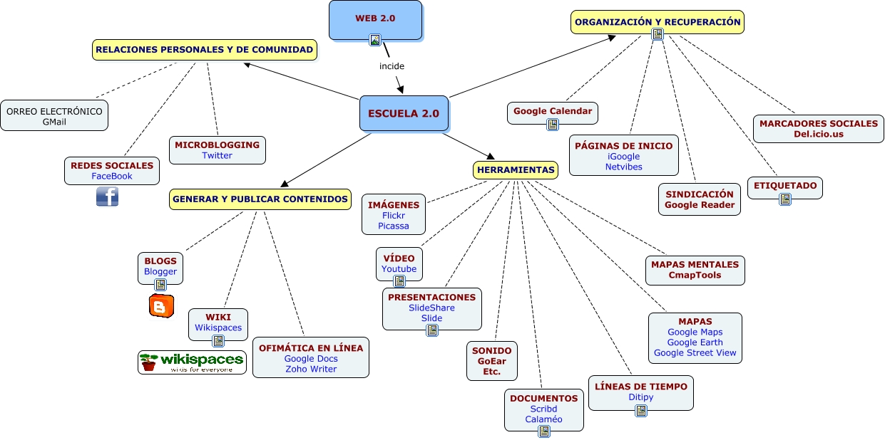 Este Cmap, tiene información relacionada con: Escuela 2.0, ESCUELA 2.0 RELACIONES PERSONALES Y DE COMUNIDAD REDES SOCIALES FaceBook, ESCUELA 2.0 HERRAMIENTAS PRESENTACIONES SlideShare Slide, ESCUELA 2.0 ORGANIZACIÓN Y RECUPERACIÓN Google Calendar, ESCUELA 2.0 ORGANIZACIÓN Y RECUPERACIÓN ETIQUETADO, ESCUELA 2.0 HERRAMIENTAS LÍNEAS DE TIEMPO Ditipy, ESCUELA 2.0 ORGANIZACIÓN Y RECUPERACIÓN MARCADORES SOCIALES Del.icio.us, ESCUELA 2.0 HERRAMIENTAS MAPAS MENTALES CmapTools, WEB 2.0 incide ESCUELA 2.0, ESCUELA 2.0 RELACIONES PERSONALES Y DE COMUNIDAD MICROBLOGGING Twitter, ESCUELA 2.0 HERRAMIENTAS DOCUMENTOS Scribd Calaméo, ESCUELA 2.0 GENERAR Y PUBLICAR CONTENIDOS OFIMÁTICA EN LÍNEA Google Docs Zoho Writer, ESCUELA 2.0 ORGANIZACIÓN Y RECUPERACIÓN PÁGINAS DE INICIO iGoogle Netvibes, ESCUELA 2.0 RELACIONES PERSONALES Y DE COMUNIDAD ORREO ELECTRÓNICO GMail, ESCUELA 2.0 HERRAMIENTAS SONIDO GoEar Etc., ESCUELA 2.0 GENERAR Y PUBLICAR CONTENIDOS BLOGS Blogger, ESCUELA 2.0 HERRAMIENTAS IMÁGENES Flickr Picassa, ESCUELA 2.0 HERRAMIENTAS VÍDEO Youtube, ESCUELA 2.0 ORGANIZACIÓN Y RECUPERACIÓN SINDICACIÓN Google Reader, ESCUELA 2.0 HERRAMIENTAS MAPAS Google Maps Google Earth Google Street View, ESCUELA 2.0 GENERAR Y PUBLICAR CONTENIDOS WIKI Wikispaces
