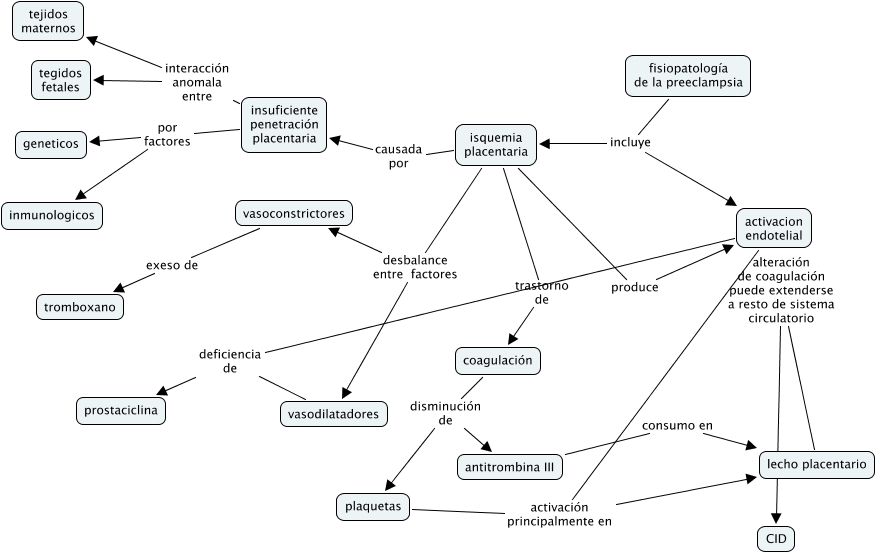 Este Cmap, tiene información relacionada con: fisiopatología PE, activacion endotelial deficiencia de prostaciclina, lecho placentario alteración de coagulación puede extenderse a resto de sistema circulatorio CID, isquemia placentaria trastorno de coagulación, fisiopatología de la preeclampsia incluye activacion endotelial, insuficiente penetración placentaria interacción anomala entre tegidos fetales, coagulación disminución de plaquetas, isquemia placentaria causada por insuficiente penetración placentaria, isquemia placentaria desbalance entre factores vasoconstrictores, coagulación disminución de antitrombina III, insuficiente penetración placentaria interacción anomala entre tejidos maternos, antitrombina III consumo en lecho placentario, activacion endotelial activación principalmente en lecho placentario, plaquetas activación principalmente en lecho placentario, vasodilatadores deficiencia de prostaciclina, fisiopatología de la preeclampsia incluye isquemia placentaria, isquemia placentaria produce activacion endotelial, insuficiente penetración placentaria por factores geneticos, vasoconstrictores exeso de tromboxano, insuficiente penetración placentaria por factores inmunologicos, isquemia placentaria desbalance entre factores vasodilatadores