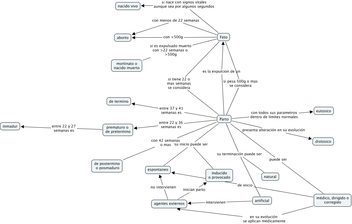 Este Cmap, tiene información relacionada con: parto_definiciones, Parto su terminación puede ser natural, Parto presenta alteración en su evolución distosico, Parto con 42 semanas o mas de postermino o posmaduro, Parto entre 22 y 36 semanas es prematuro o de pretermino, Feto con menos de 22 semanas aborto, prematuro o de pretermino entre 22 y 27 semanas es inmadur, agentes externos inician parto inducido o provocado, Parto su inicio puede ser inducido o provocado, agentes externos no intervienen espontaneo, Feto si nace con signos vitales aunque sea por algunos segundos nacido vivo, Feto si pesa 500g o mas se considera Parto, artificial intervienen agentes externos, Feto si es expulsado muerto con ᡎ semanas o g mortinato o nacido muerto, Parto entre 37 y 41 semanas es de termino, médico, dirigido o corregido de inicio espontaneo, Parto con todos sus parametros dentro de limites normales eutosico, médico, dirigido o corregido en su evolución se aplican medicamente agentes externos, Parto es la expulcion de un Feto, Parto puede ser médico, dirigido o corregido, Feto con g aborto