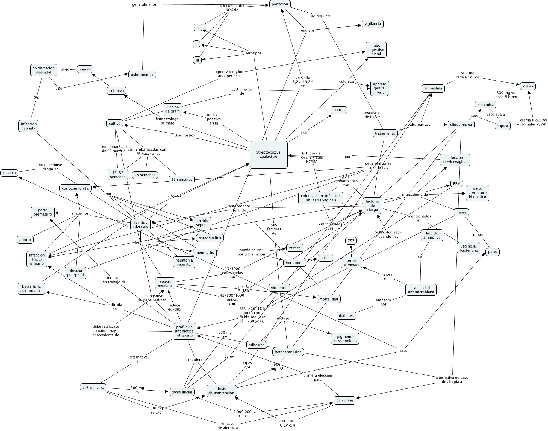 Este Cmap, tiene información relacionada con: streptococcus agalactiae, factores de riesgo antecedente de infeccion tracto urinario, sepsis neonatal 13/1000 colonizadas sin factores de riesgo, factores de riesgo antecedente fetal de eventos adversos, eventos adversos fetales meningitis, fiebre durante parto, tratamiento alternativas clindamicina, capacidad antimicrobiana empeora por diabetes, fiebre RPM ᡈ-18 h junto con fiebre requiere (sin cultivoss) profilaxis antibiotica intraparto, sistemica 300 mg vo cada 8 h por 7 dias, eventos adversos fetales artritis septica, meningitis puede ocurrir por transmicion horizontal, clindamicina 900 mg c/8 dosis de mantencion, infeccion neonatal como meningitis, profilaxis antibiotica intraparto indicada en trabajo de parto prematuro, tratamiento debe realizarse cuando hay infeccion tracto urinario, clindamicina vias topica, colonizacion neonatal 2% infeccion neonatal, factores de riesgo antecedente de parto prematuro idiopatico, eventos adversos maternos infeccion tracto urinario, penicilina 2.000.000 U EV c/4 dosis de mantencion