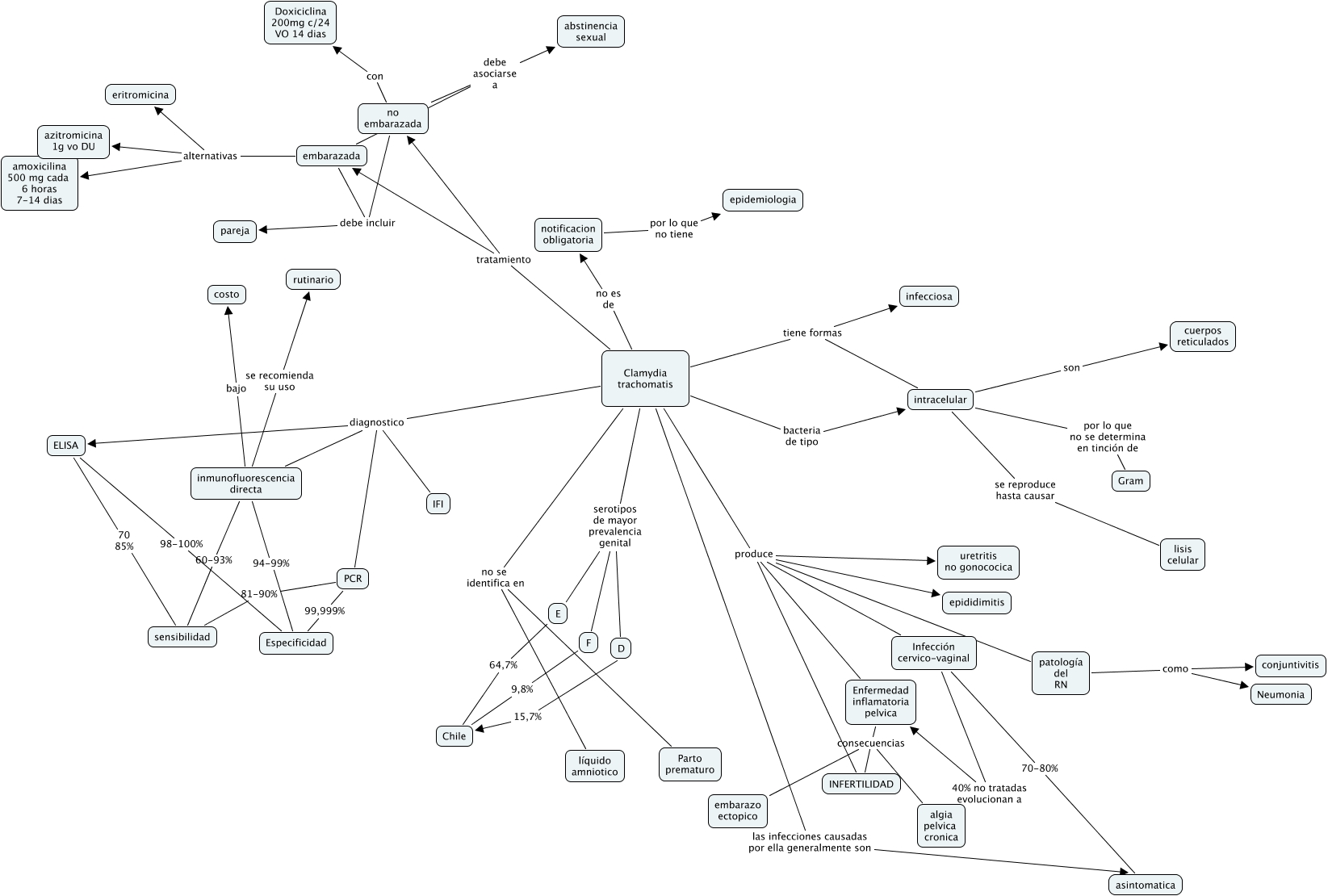 Este Cmap, tiene información relacionada con: clamydia, D 15,7% Chile, Clamydia trachomatis diagnostico ELISA, Clamydia trachomatis produce uretritis no gonococica, notificacion obligatoria por lo que no tiene epidemiologia, Enfermedad inflamatoria pelvica consecuencias algia pelvica cronica, no embarazada debe asociarse a abstinencia sexual, Clamydia trachomatis diagnostico IFI, embarazada debe incluir pareja, Clamydia trachomatis produce Infección cervico-vaginal, Infección cervico-vaginal 70-80% asintomatica, Enfermedad inflamatoria pelvica consecuencias embarazo ectopico, embarazada alternativas azitromicina 1g vo DU, Clamydia trachomatis serotipos de mayor prevalencia genital D, Clamydia trachomatis diagnostico PCR, ELISA 98-100% Especificidad, PCR 99,999% Especificidad, Clamydia trachomatis no se identifica en Parto prematuro, Clamydia trachomatis serotipos de mayor prevalencia genital F, Clamydia trachomatis produce INFERTILIDAD, PCR 81-90% sensibilidad